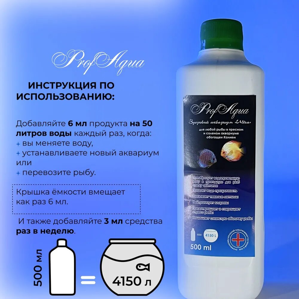 | Способ применения | добавляйте 6 мл (1 колпачек-крышка) жидкости на 50 литров воды каждый раз, когда меняете воду, устанавливаете новый аквариум или перевозите рыбу. А также добавляйте 3 мл (1/2 крышки) средства на 50 литров воды один раз в неделю. |