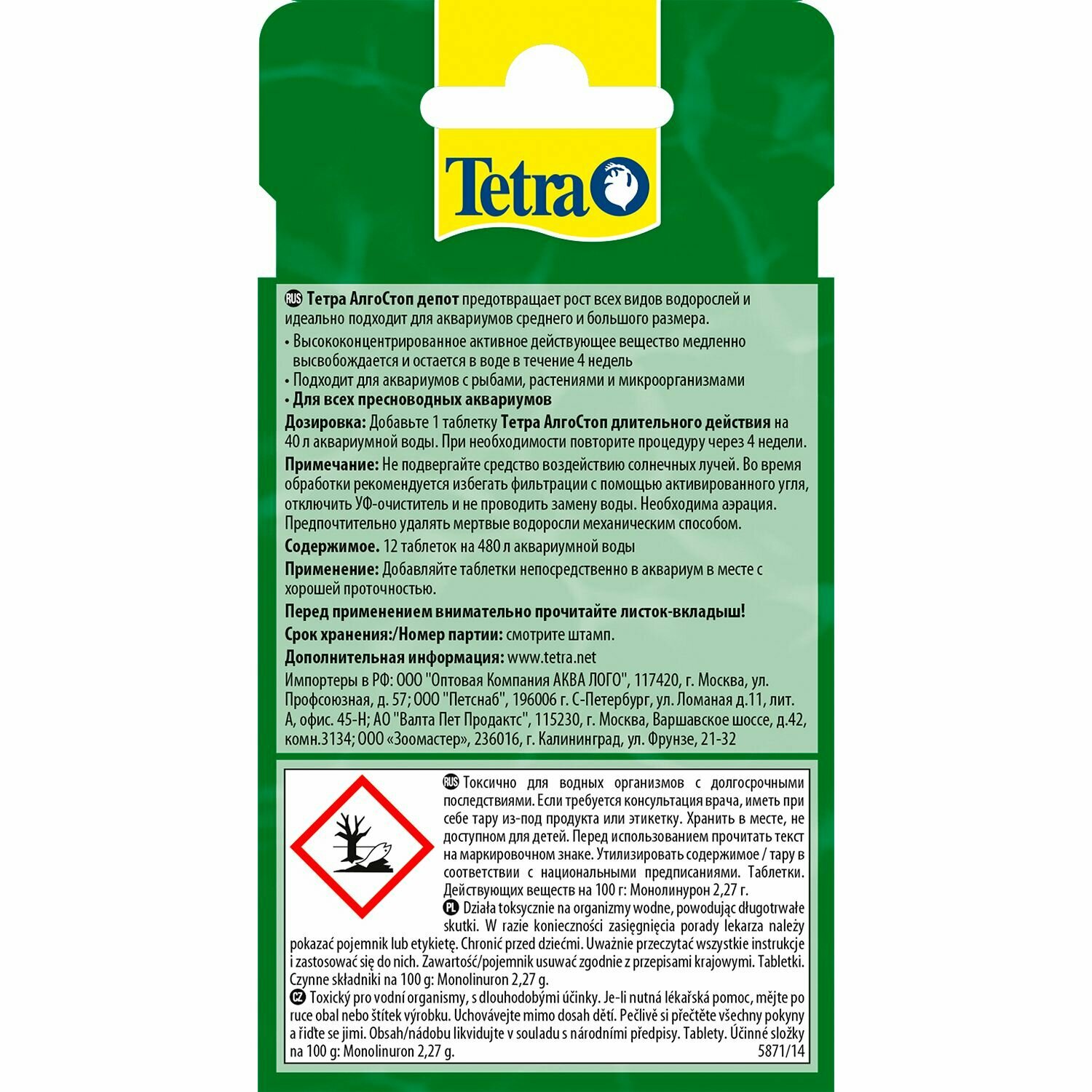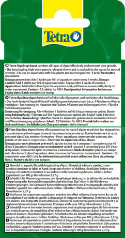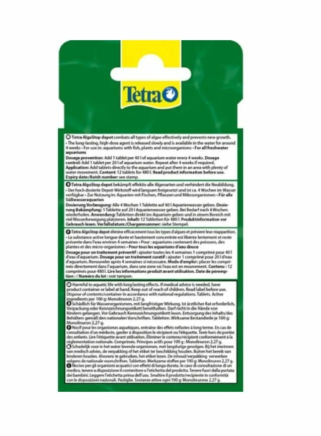 | Комплектация | Средство против водорослей Tetra ALGOstopdepot 12 таблеток на 480л |