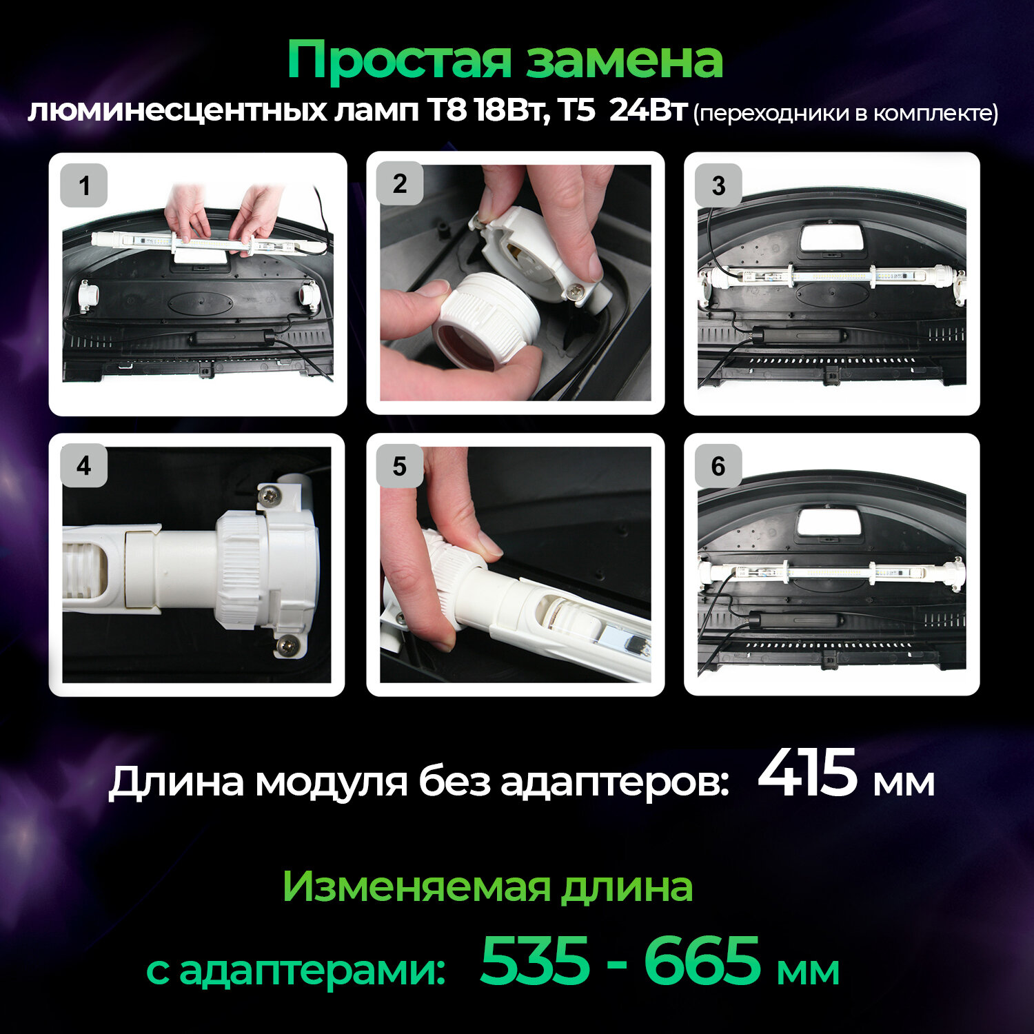 | Подробная комплектация | 1. Модуль освещения, 2. Комплект адаптеров для Т5 ламп (2 шт.), 3. Комплект адаптеров для Т8 ламп (2 шт.), 4. Комплект корпус-держателей ламп (2 шт.), 5. Инструкция с гарантийным талоном. |