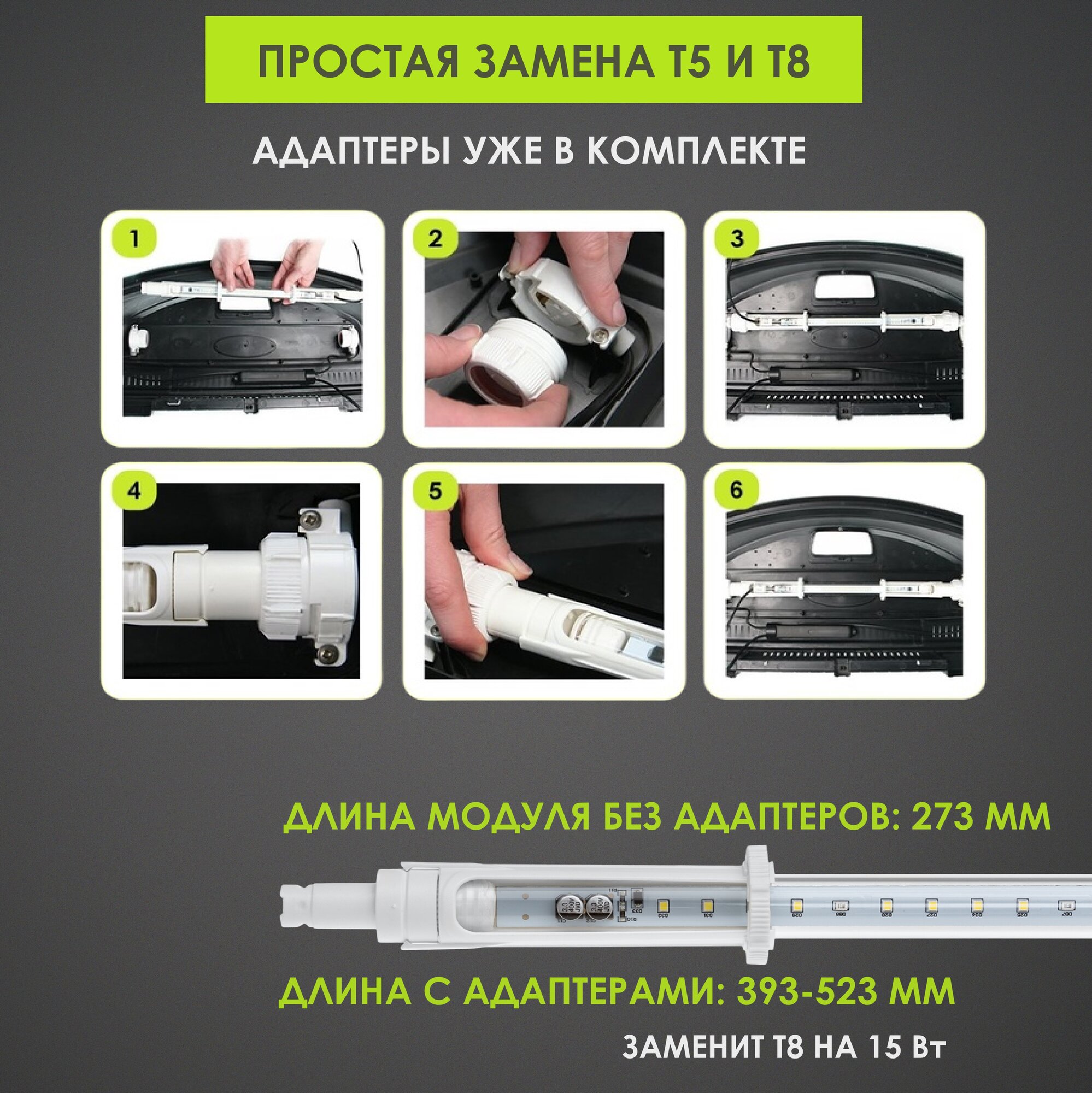 | Подробная комплектация | 1. Модуль освещения, 2. Комплект адаптеров для Т5 ламп (2 шт.), 3. Комплект адаптеров для Т8 ламп (2 шт.), 4. Комплект корпус-держателей ламп (2 шт.), 5. Инструкция с гарантийным талоном. |