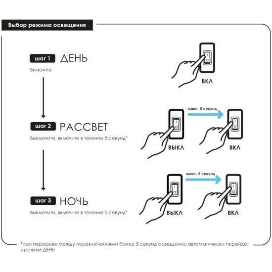 | Дополнительная информация | Три режима освещения можно переключать на шнуре питания: рассвет / daybreak — рекомендуется в качестве первого режима после ночного перерыва или при кормлении рыб, характеризуется пониженной интенсивностью; день / day — максимально приближенный к солнечному, подчеркивает естественный окрас всех обитателей аквариума ночь / night — для оформления аквариумов с флуоресцирующими рыбами и декорациями (светятся в синем спектре) и для детской комнаты (на время сна ребенка, который боится засыпать в темноте). |