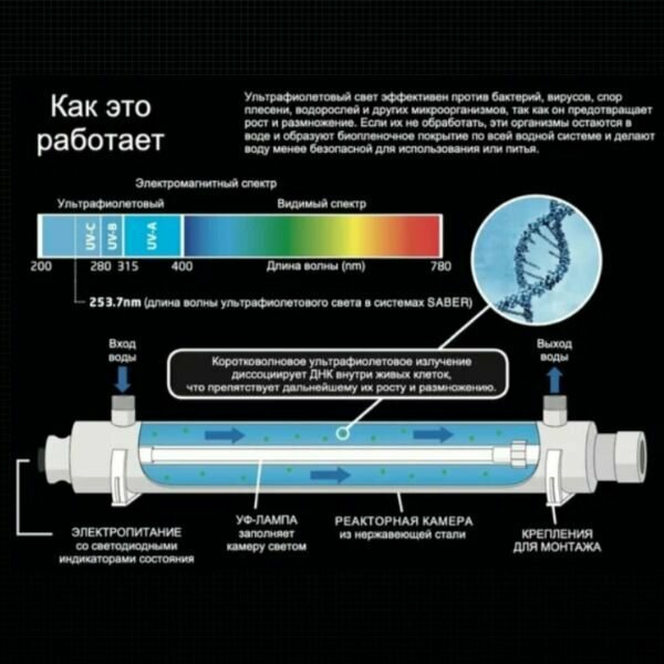 | Дополнительная информация | обеззараживание питьевой воды; срок службы лампы примерно 9000 часов; вертикальная или горизонтальная установка; макс. температура воды на входе: 40 °C; мин. температура воды на входе: 2 °C; макс. давление на входе: 6 атм; рекомендуемая производительность: 25 л/мин |