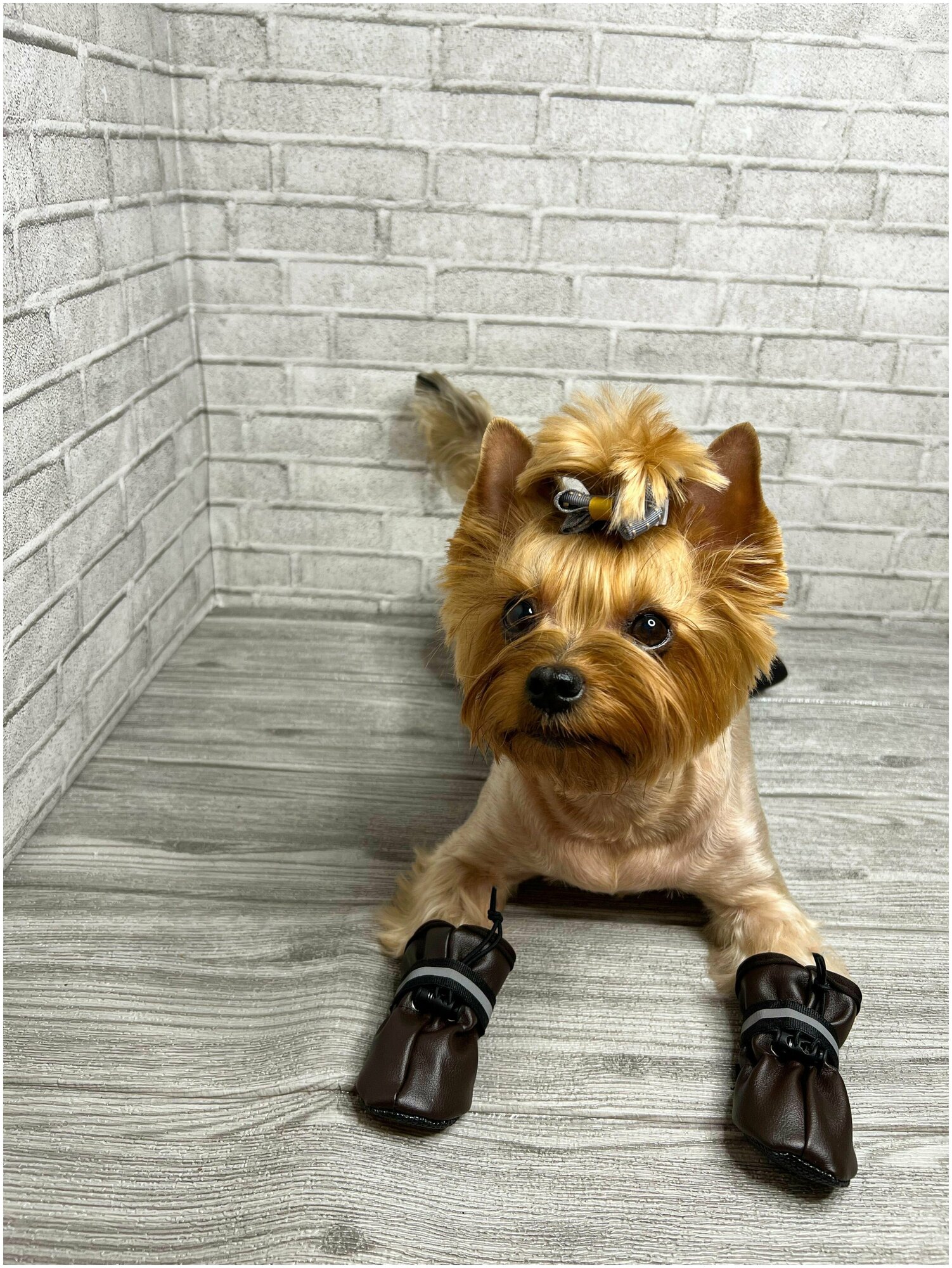 Обувь для собак на меху из эко кожи / Двойная фиксация: затяжка и липучка / Непромокаемые / Размер 1 / Коричневые