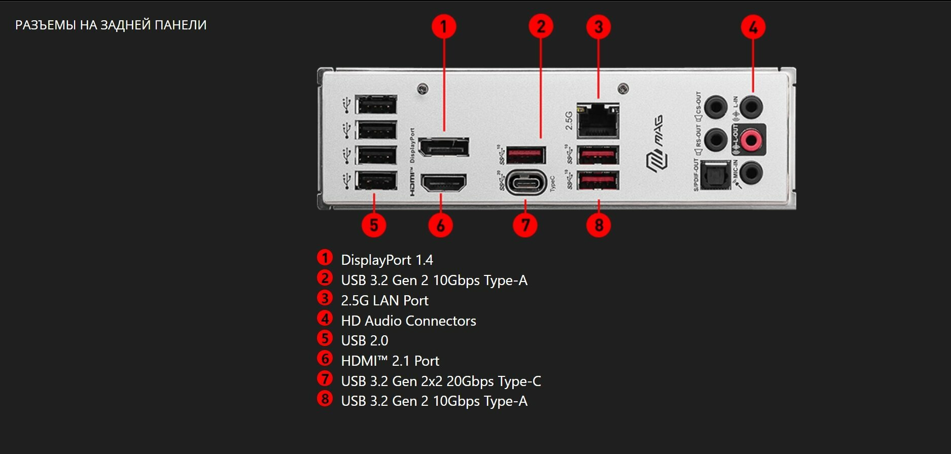 | Разъемы на задней панели | 4 x USB 2.0 Type-A, 4 x USB 3.2 Gen2x2 Type-A, DisplayPort, HDMI, LAN RJ-45, SMA (для антенны Wi-Fi), USB 3.2 Gen2x2 Type-C, выход S/PDIF оптический |