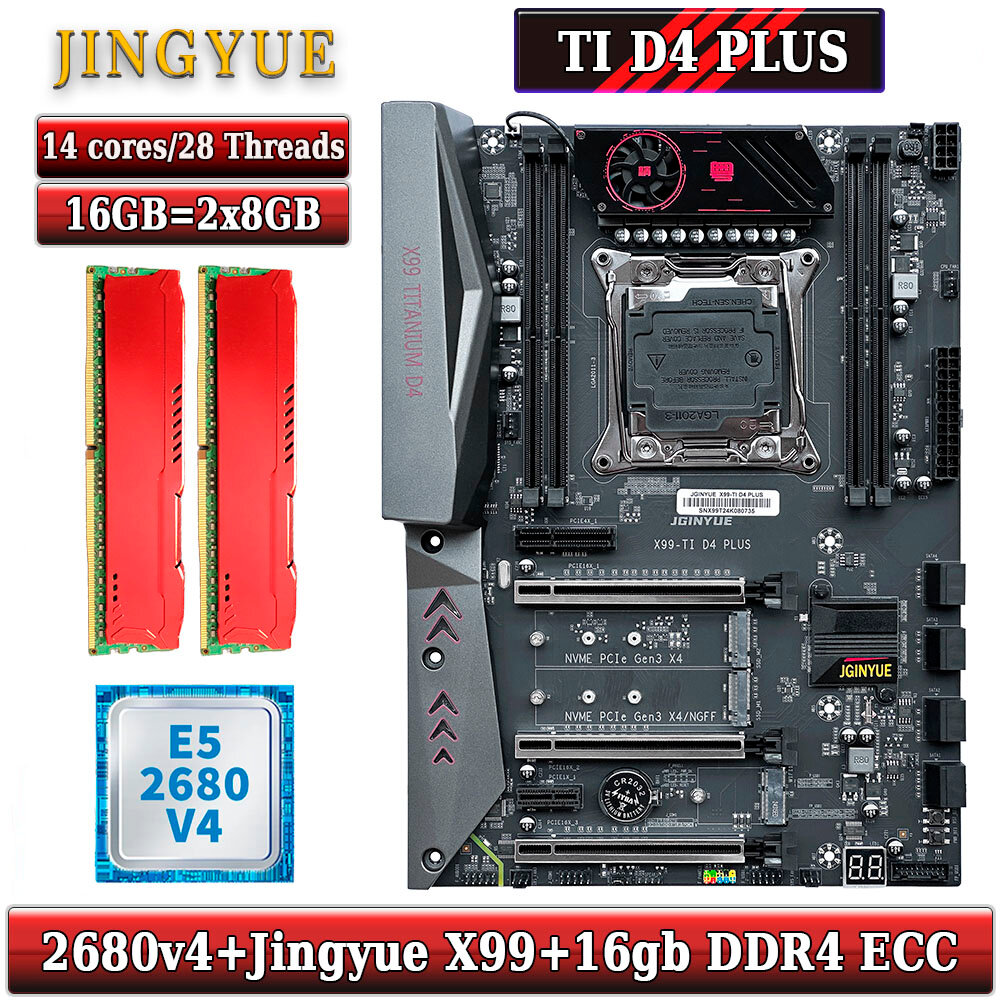 Купить Комплект материнская плата Jingyue X99 Titanium D4 + Xeon 2680V4 + 16GB DDR4 ECC 2x8GB Red