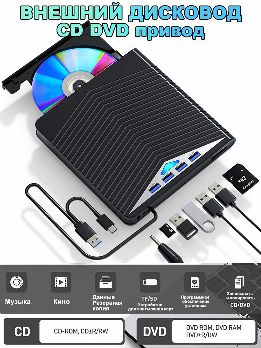 Купить Внешний дисковод для ноутбука компьютера ПК CD DVD оптический привод USB Хаб 7в1