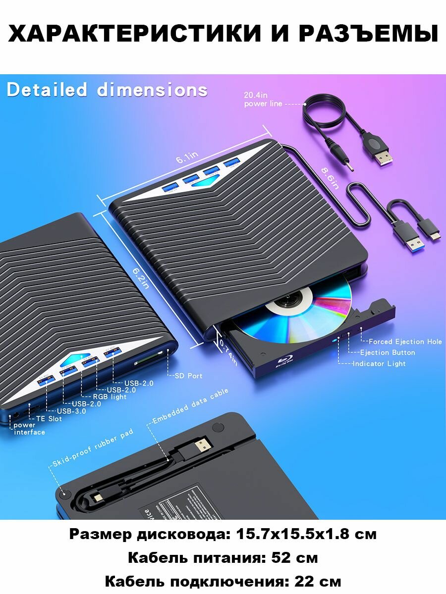 Внешний дисковод для ноутбука компьютера ПК CD DVD оптический привод USB Хаб 7в1 интересное:
