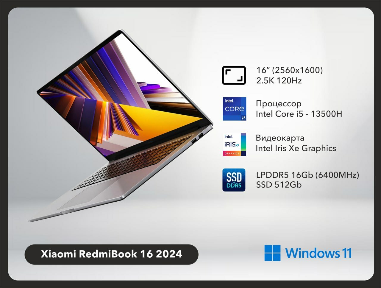 Ноутбук Xiaomi RedmiBook 16" 2024 JYU4577CN, i5 13500H/16Gb/SSD512Gb/IrisXe/16" 2560x1600 IPS 120Hz/Windows11/серебристый интересное: