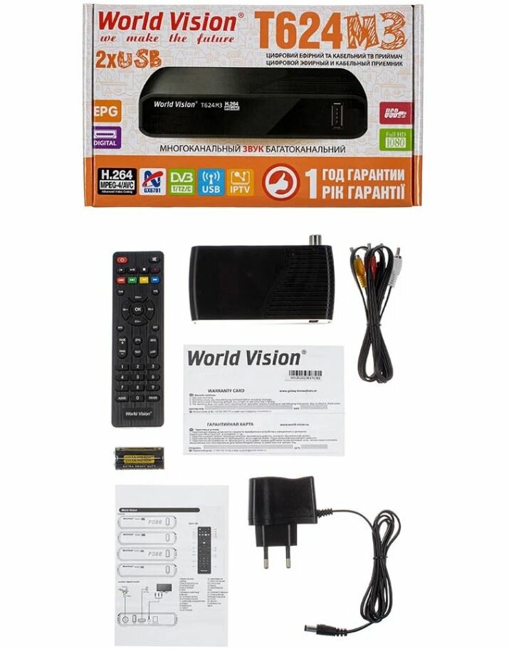 Купить TV-тюнер WORLD VISION T624 M3 (T2+C,пластик,без дисплея и кнопок,выносной БП,IPTV,DD)