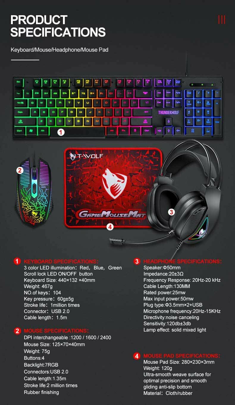 Купить Игровой набор Thunder Wolf TF400, клавиатура, мышь, гарнитура, RGB