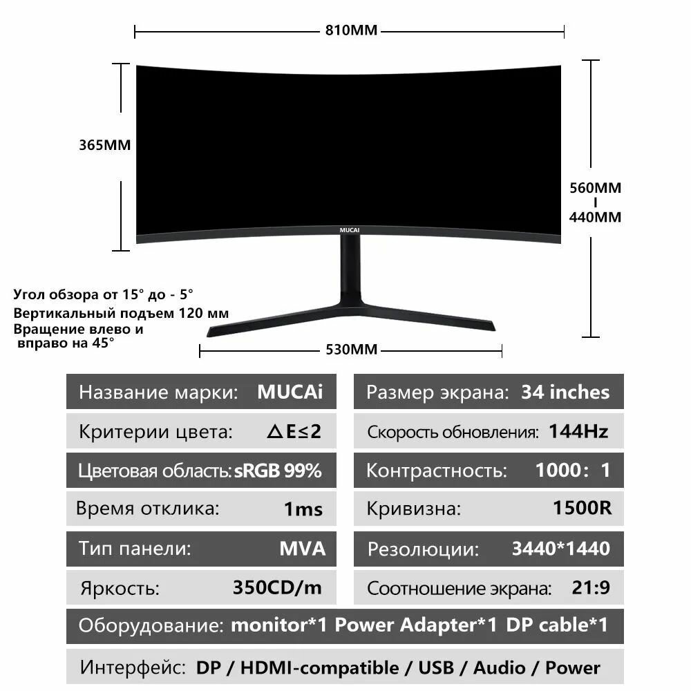 34" Монитор MUCAI NQ3488 WQHD 165Hz Искривление черный интересное: