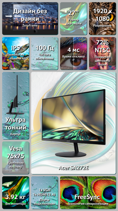 Монитор Acer 27" SA272Ebi Black (IPS, 1920x1080, D-sub+HDMI, 4 ms, 178°/178°, 250 cd/m, 1000:1 (100M:1), 100Hz) интересное: