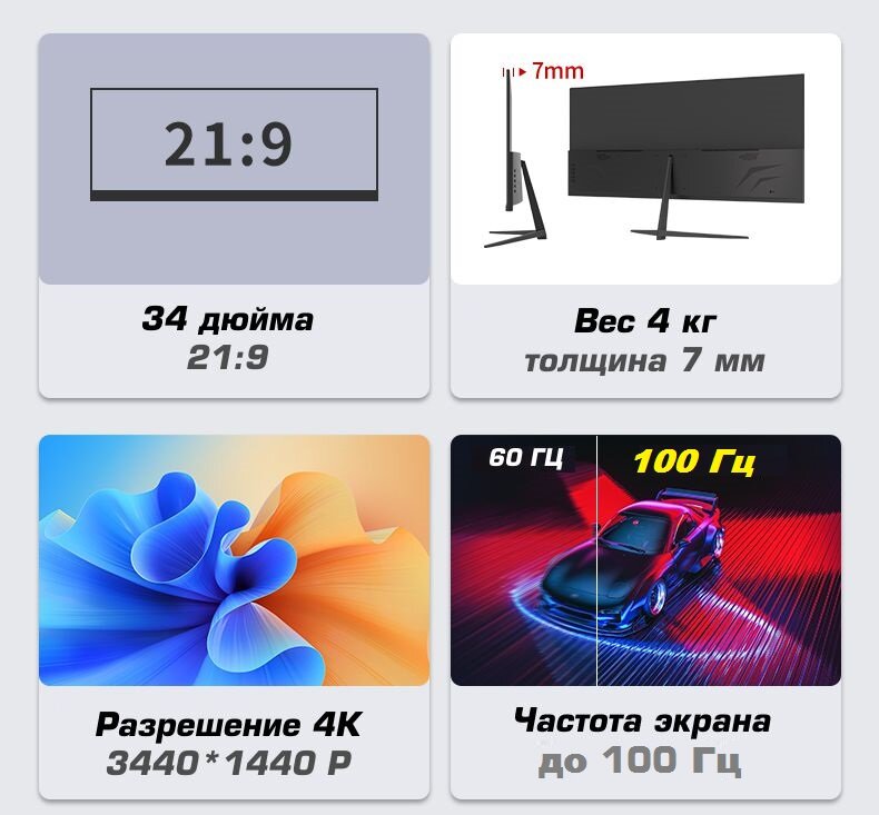 34" Монитор 4K, 21:9, YSNO W34Q144, 3440×1440, 100 Гц, IPS, чёрный интересное: