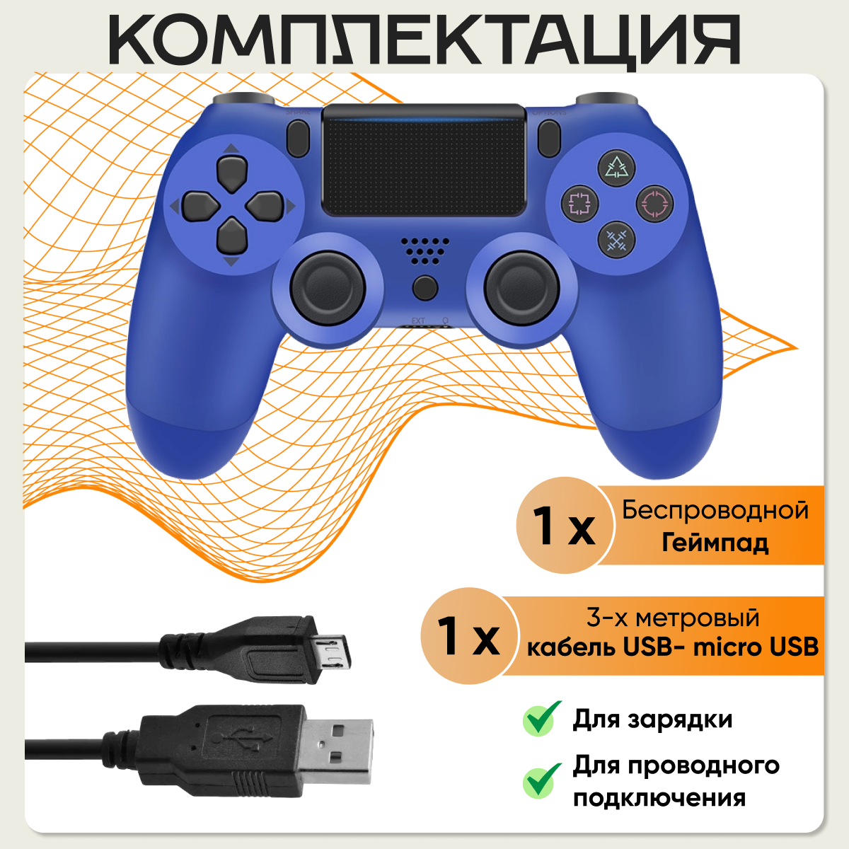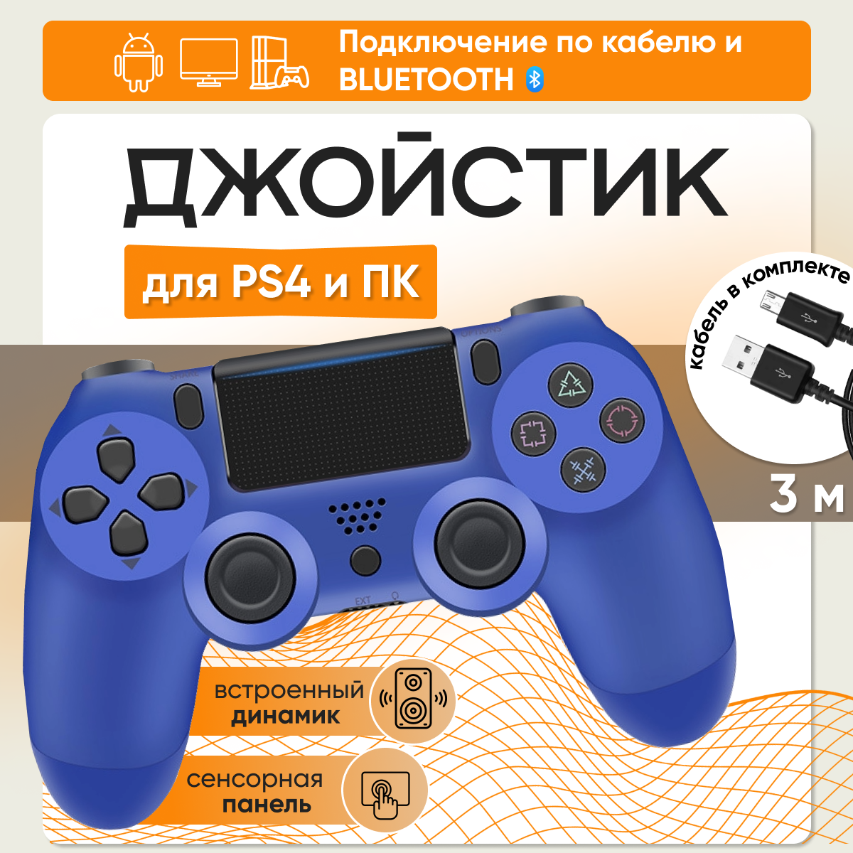 Беспроводной геймпад для игровой приставки PS4 + кабель 3 метра / Джойстик для ПК / Контроллер для ТВ приставки, Синий