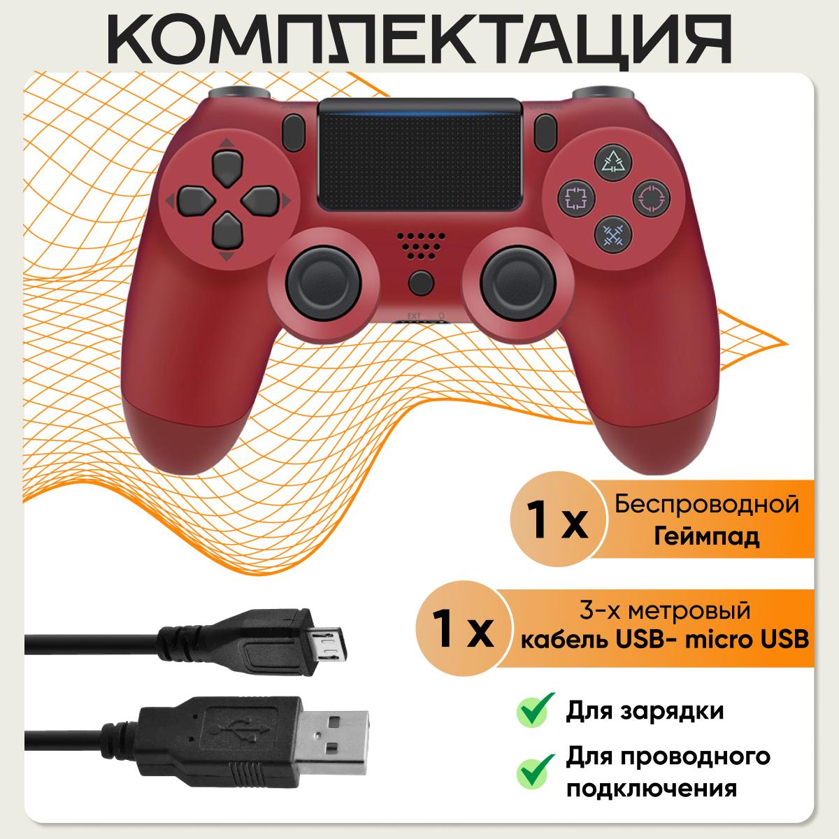 Беспроводной геймпад для игровой приставки PS4 + кабель 3 метра / Джойстик для ПК / Контроллер для ТВ приставки, Оранжевый