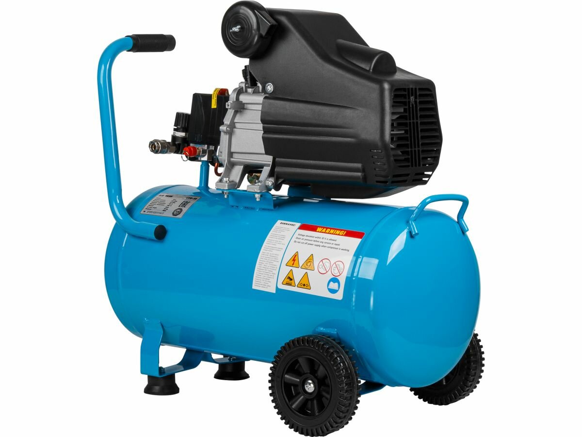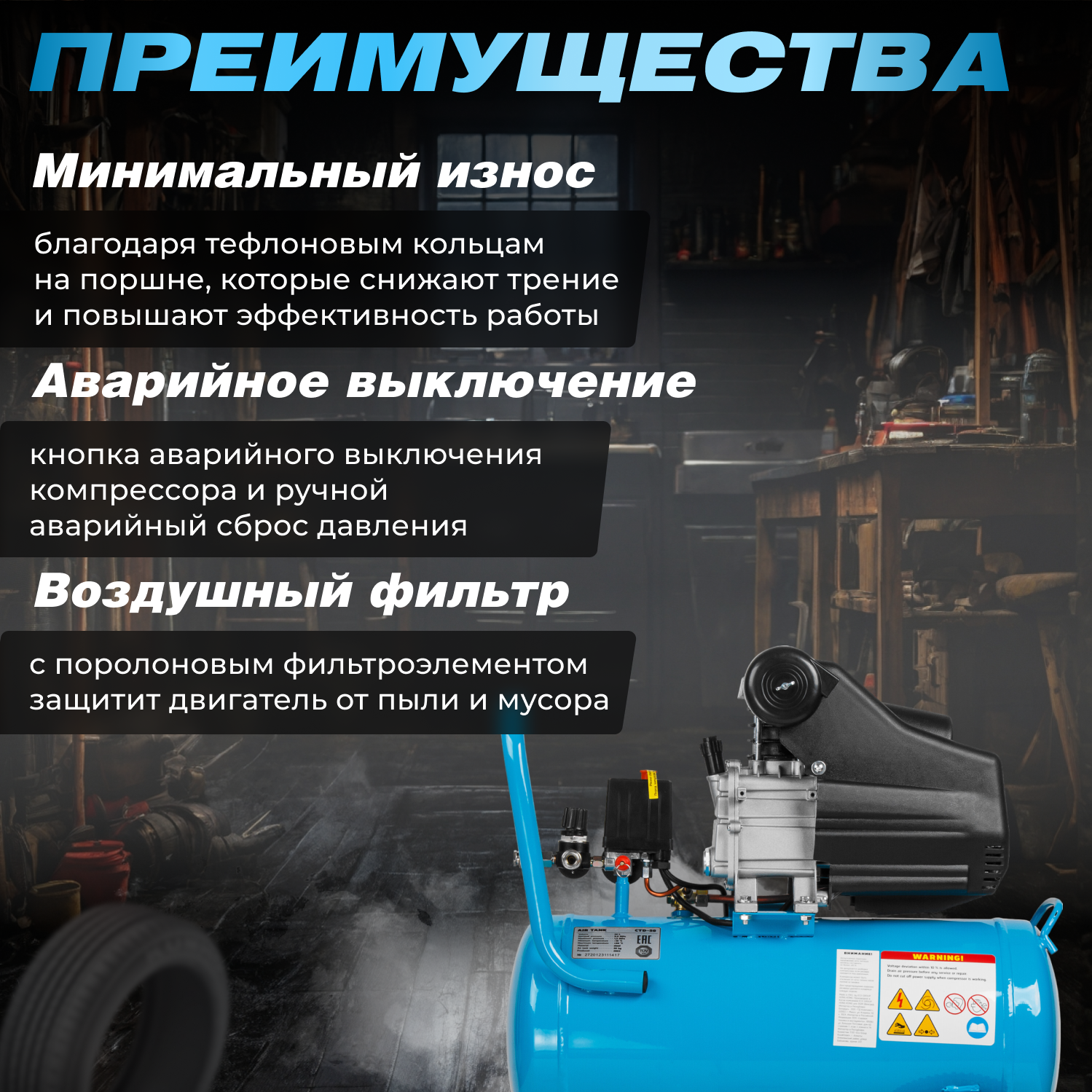 Мощный трехцилиндровый двигатель. Быстрый запуск и заполнение ресивера. Большой объем ресивера (50 л.) обеспечивает ровную и долгую подачу воздуха.