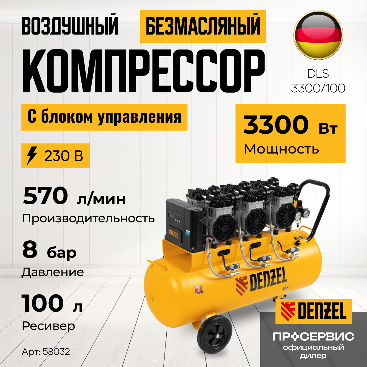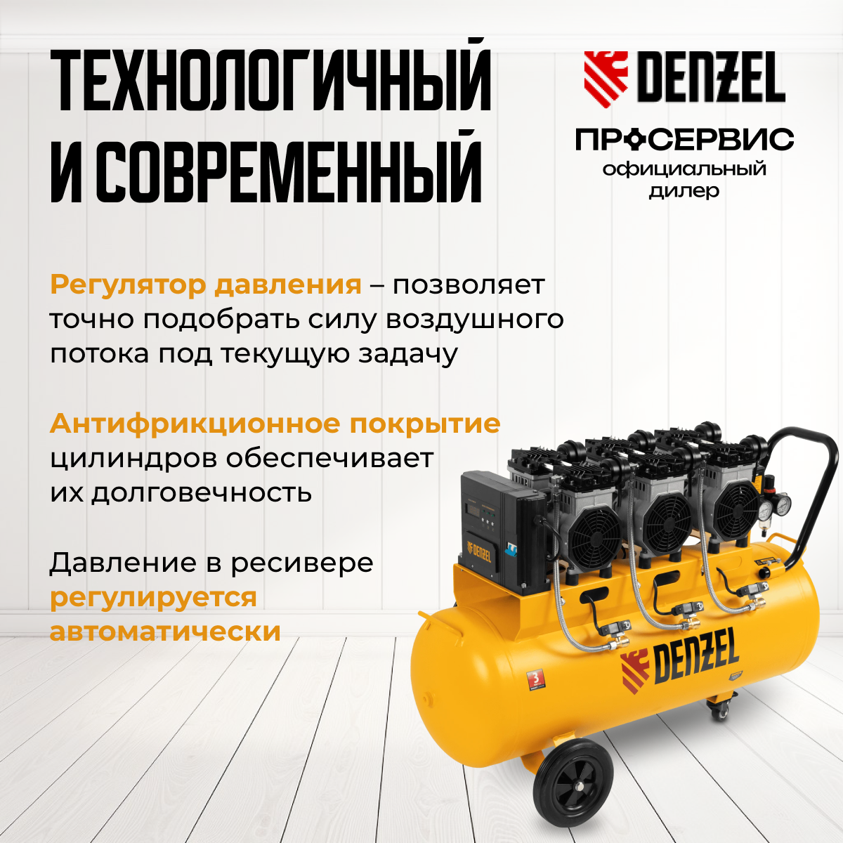 Компрессор безмаслянный малошумный Denzel DLS 3300/100 3300 Вт, 3х1100, 100 л, 570 л/мин блок упр 58032 интересное: