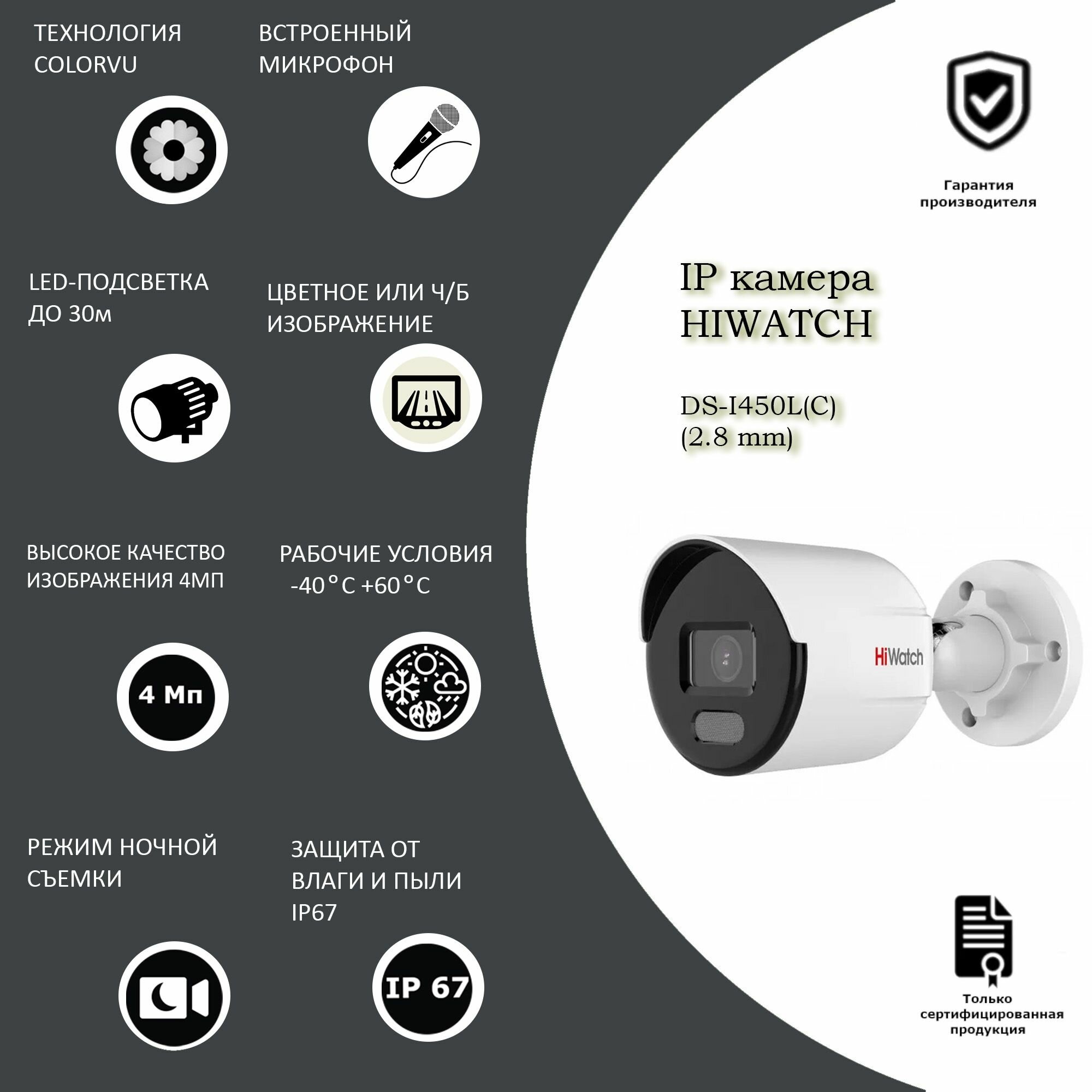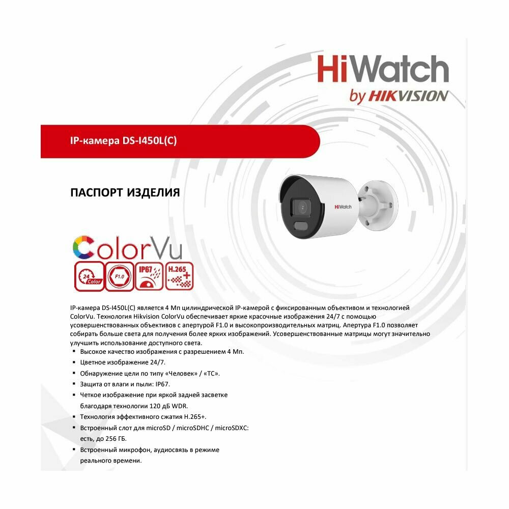 ip Видеокамера DS-i450L(C)(2.8mm) HiWatch, ColorVU (цветное изображение 24/7, микрофон, слот под карту памяти