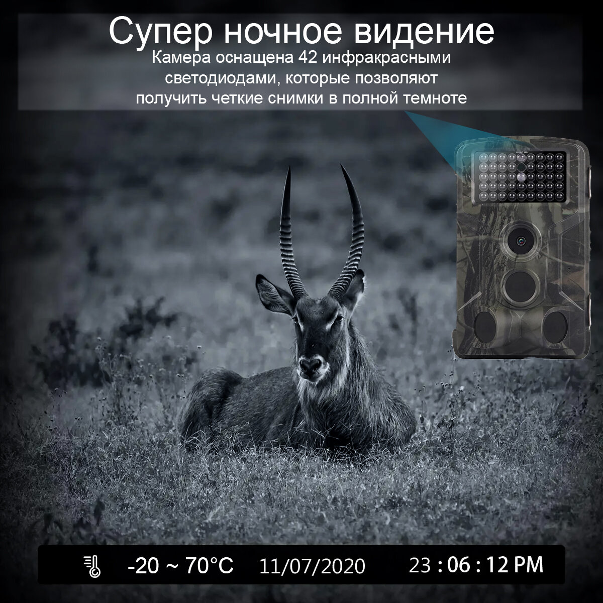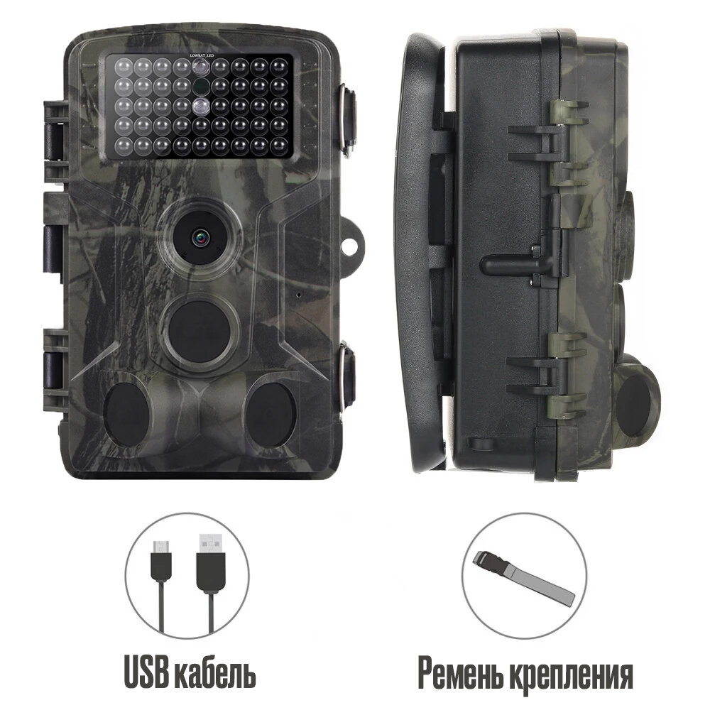 | Дополнительная информация | PIR Дальность обнаружения в темноте: до 20 метров; ИК Подсветка: 42 IR диода; Дисплей: 2" ЖК; Память (не входит в комплект): microSD-карта до 32 Гб макс, 10 класс; Разрешение изображения: 24MP=7096x3760, 20МР=6048х3384, 16MP=5360х3200, 12МР=4032x3024, 8MP=3264x2448; Разрешение видео: 1080P (30fps), 720P (30fps); PIR Чувствительность: до 20 метров регулируемая (высокая / нормальная / низкая); Время срабатывания: 0.2 секунды; Работа / Температура хранения: -20 - +70 ° C; Интервал съемки: 1 сек - 30 мин; Режим timelapse: 5 мин, 30 мин, 60 мин; Серия фото: 1-3-6-9 шт.; Продолжительность видео: 10 - 90 сек; Питание: 8хАА, или DC 6V (в комплект не входит); Потребляемый ток: 150мА; Сигнал низкого заряда батареи: световой индикатор, индикация на дисплее; Запись звука: да; Монтаж: пояс, Python замок; Размеры: 135x90x76 мм без антенны; Вес: 400 гр; Допустимая влажность использования: 5% - 90%. |