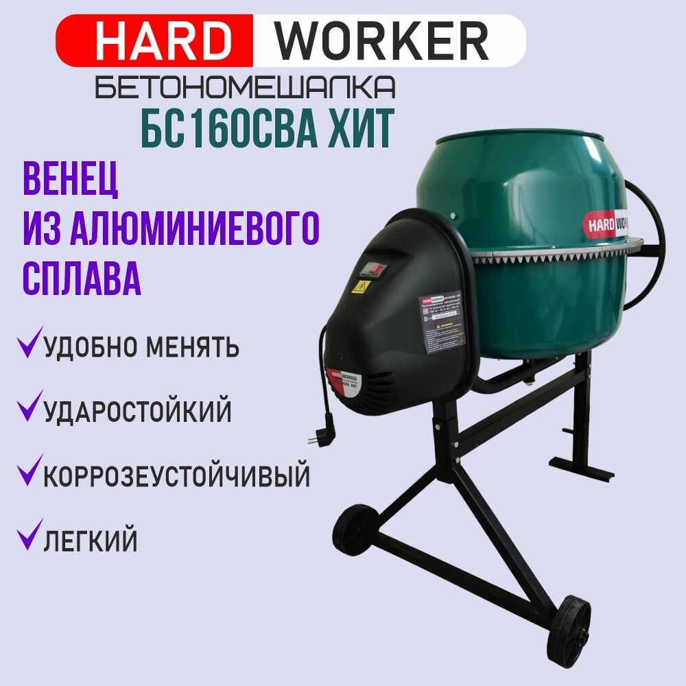 Бетономешалка строительная HARD WORKER БС160СВА ХИТ сегментный венец из алюминиевого сплава, объем 140 литров, мощность 600 Вт, бетоносмеситель электрический интересное: