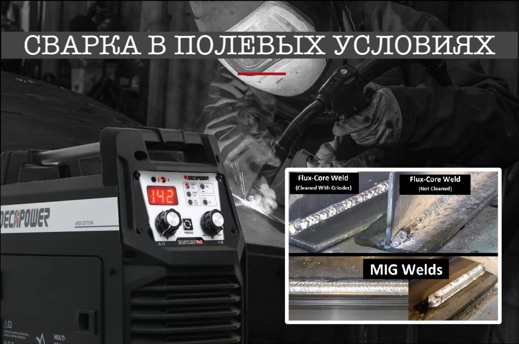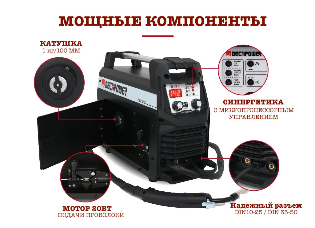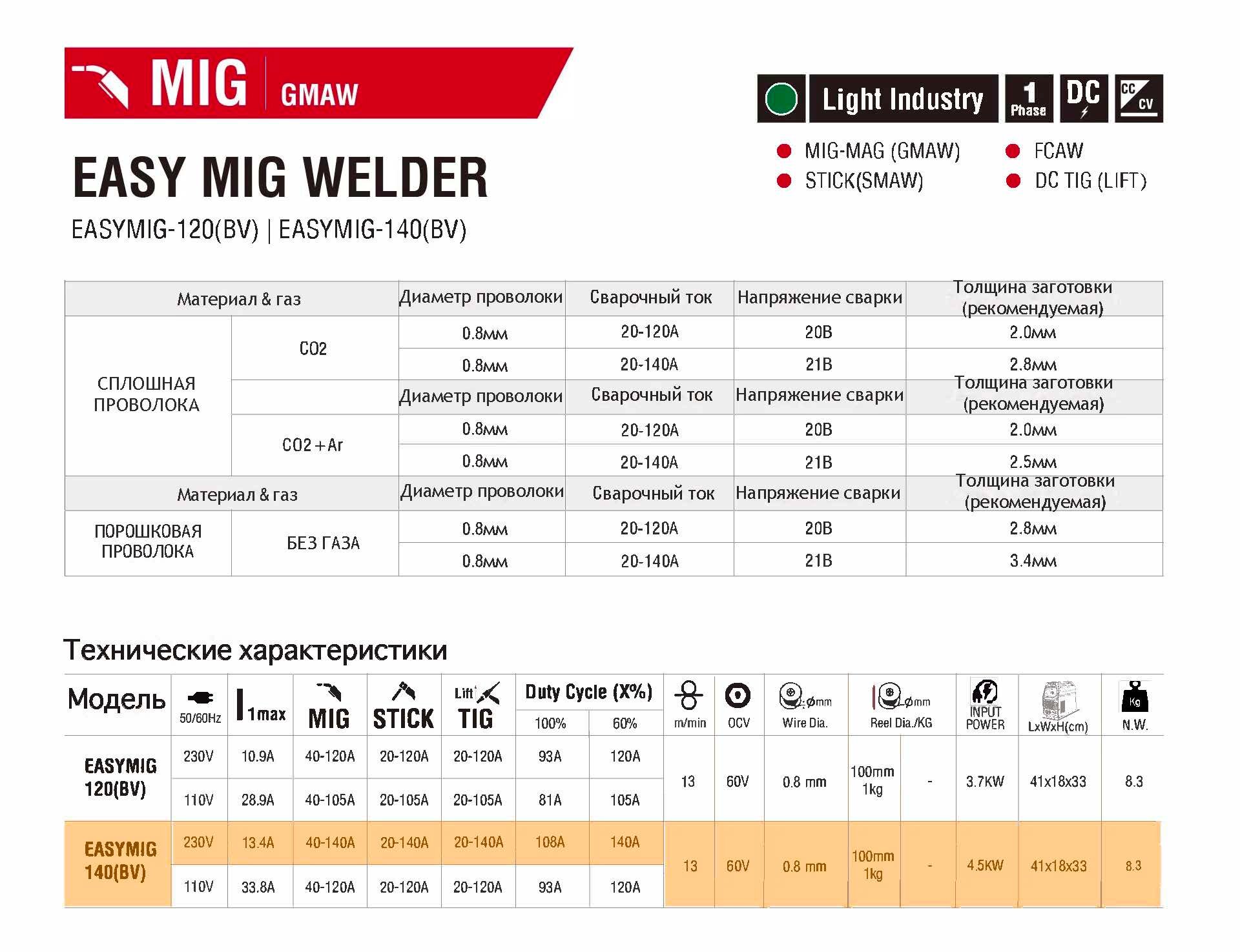Сварочный полуавтомат инверторного типа DECAPOWER EASYMIG 140 с микропроцессорным управлением, активной синергией, MIG, MAG, FLUX, ММА, Lift TIG, 4 в 1 интересное: