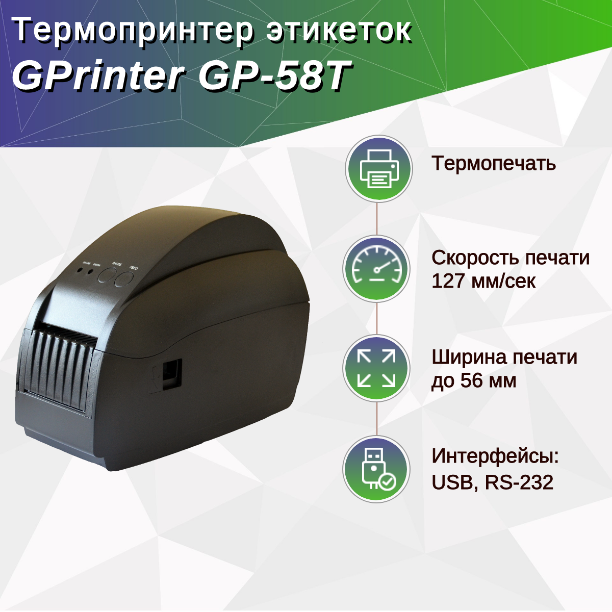 Термопринтер этикеток GPrinter GP-58T (термопечать, 203 dpi, ширина печати 56 мм, USB, RS-232) интересное: