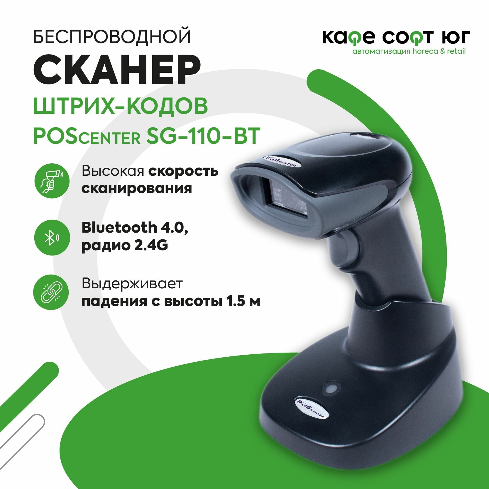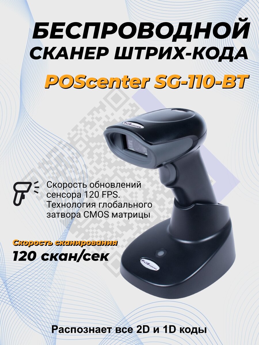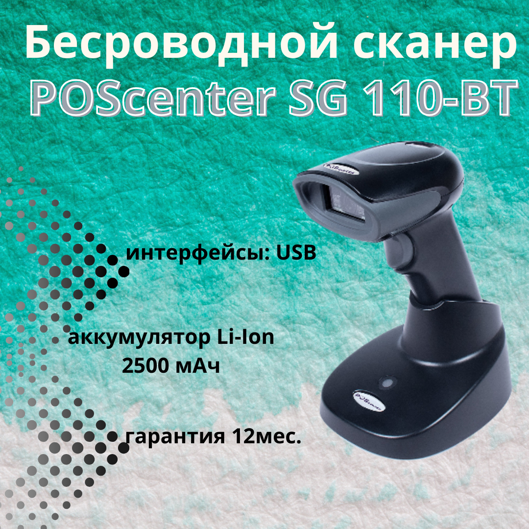 Сканер штрих-кода POScenter SG-110-BT, беспроводной, адаптер 2.4G, 1.5 м, кредл