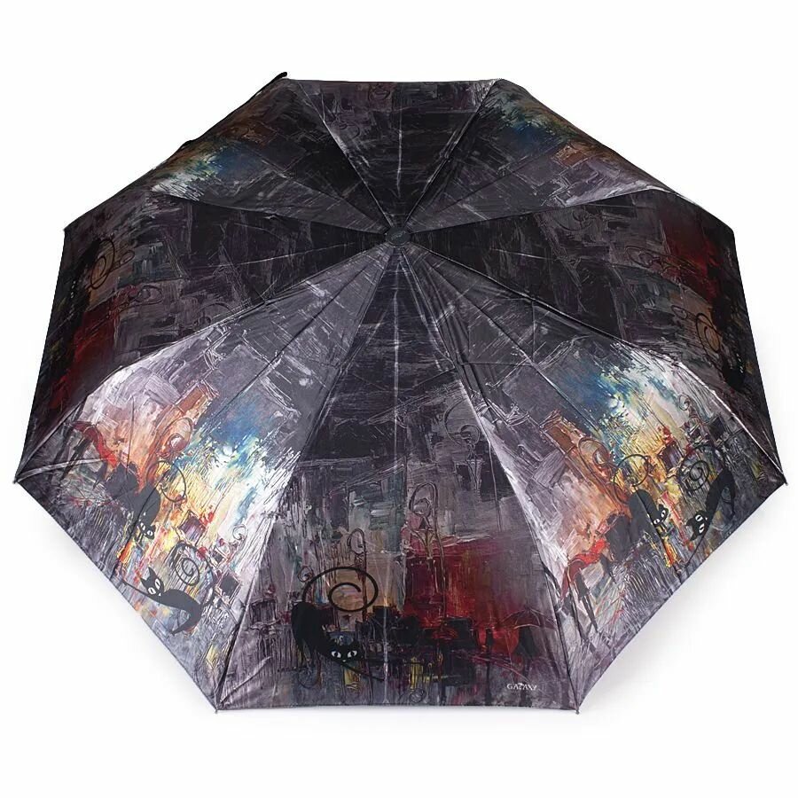 Зонт женский Galaxy 3001 Коты в ночном городе серый металлик полуавтомат 3 сложения интересное: