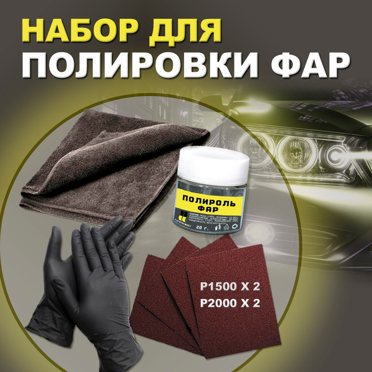 | Подробная комплектация | полироль для авто 20 мл, перчатки нитриловые, наждачная бумага 4 листа (1500, 2000), салфетка из микрофибры черная 30х30 см, инструкция |
