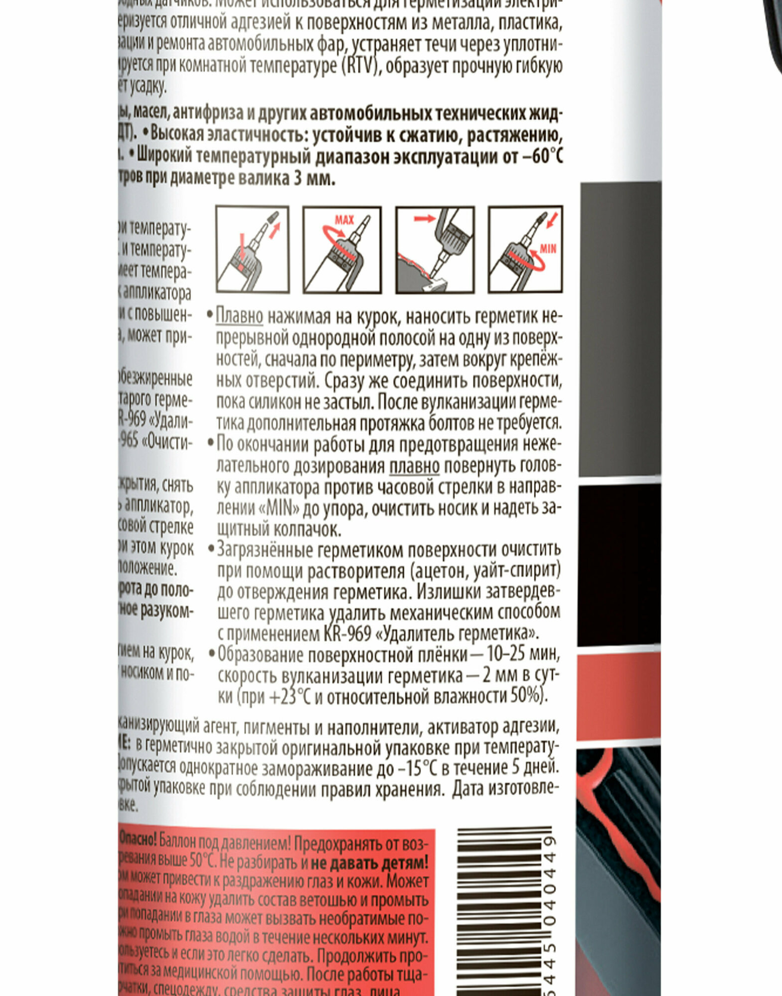| Дополнительная информация | Применять средства защиты кожи, глаз и органов дыхания. Прямой контакт с незасохшим герметиком может привести к раздражению и вызвать аллергическую реакцию. При попадании на кожу удалить состав ветошью и смыть большим количеством воды с мылом. При попадании в глаза может вызвать необратимые последствия. В случае попадания осторожно промыть глаза большим количеством воды. Снять контактные линзы, если вы ими пользуетесь и продолжить промывание глаз. При необходи- мости обратиться за медицинской помощью. Хранить в недоступном для детей месте. После работы тщательно вымыть руки. Не вдыхать пары. Использовать в хорошо проветриваемом месте. Утилизиро- вать содержимое/тару в соответствии с местными/региональными/национальными/международными предписаниями. Не допускать попадания в окружающую среду |