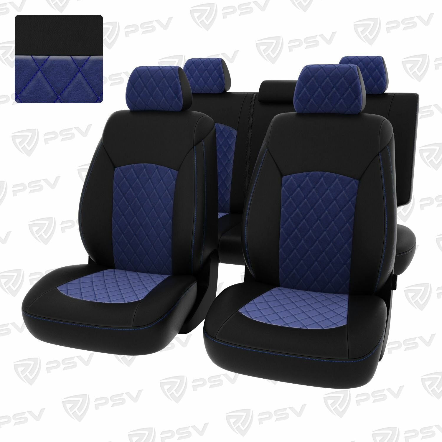 Купить Чехлы в машину PSV для Chevrolet Cruze/Шевроле Круз I 2009-2015 г. - 5 подголовников, ромб/отстрочка синяя, черная экокожа + синий велюр "Оригинал"