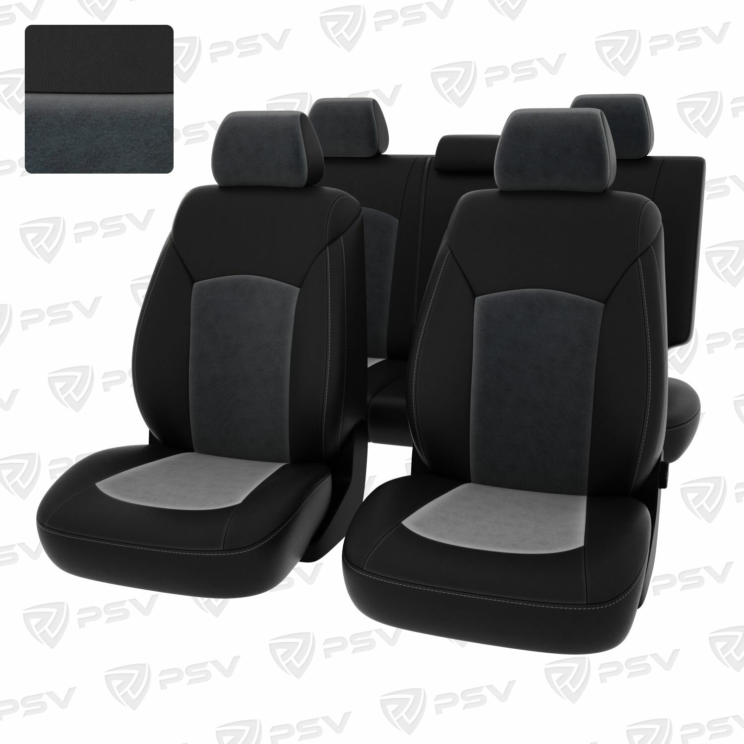 Чехлы в машину PSV для Chevrolet Cruze/Шевроле Круз I 2009-2015 г. - 5 подголовников, ромб/отстрочка серая, черная экокожа + серый велюр "Оригинал"