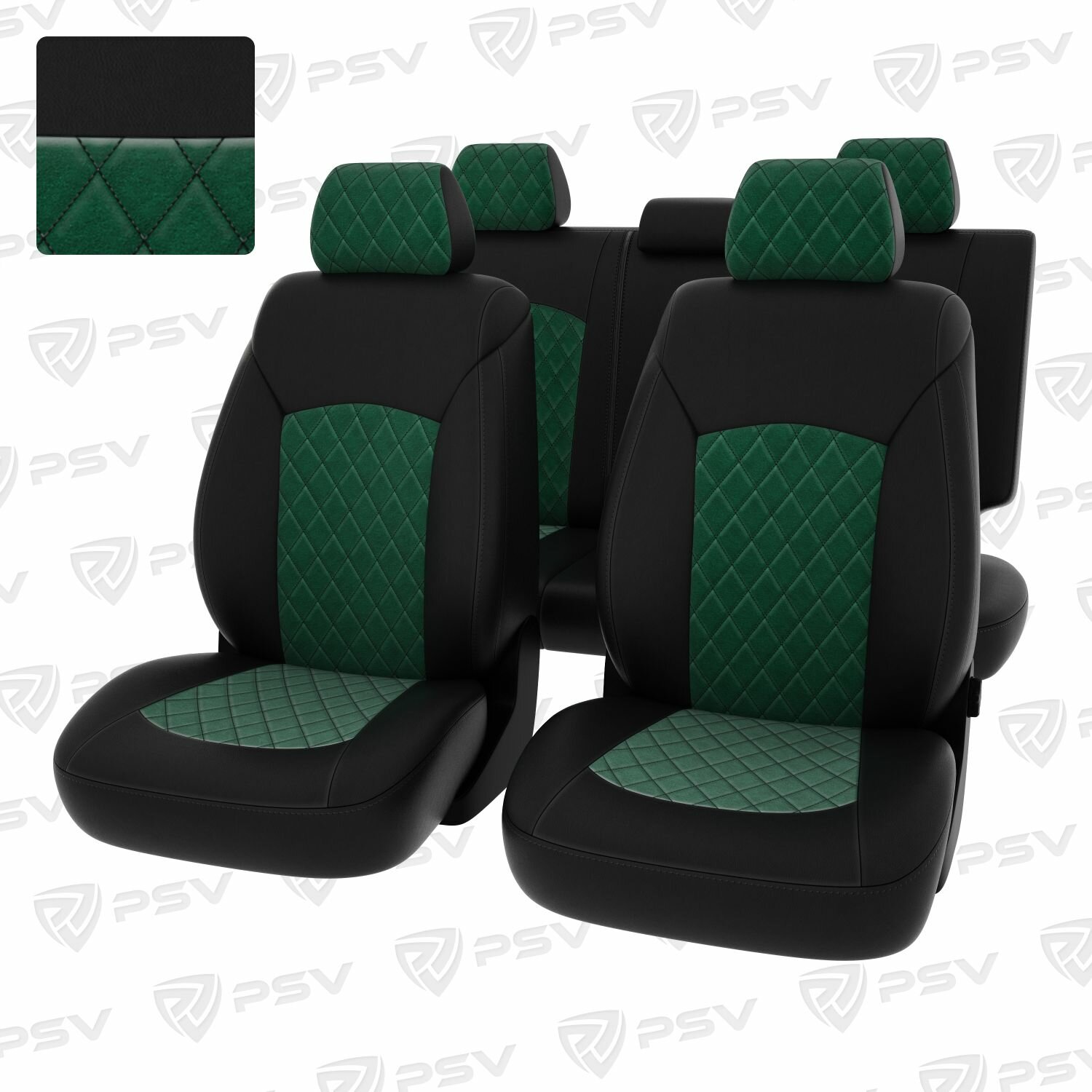 Купить Чехлы в машину PSV для Chevrolet Cruze/Шевроле Круз I 2009-2015 г. - 5 подголовников, ромб/отстрочка черная, черная экокожа + зеленый велюр "Оригинал"