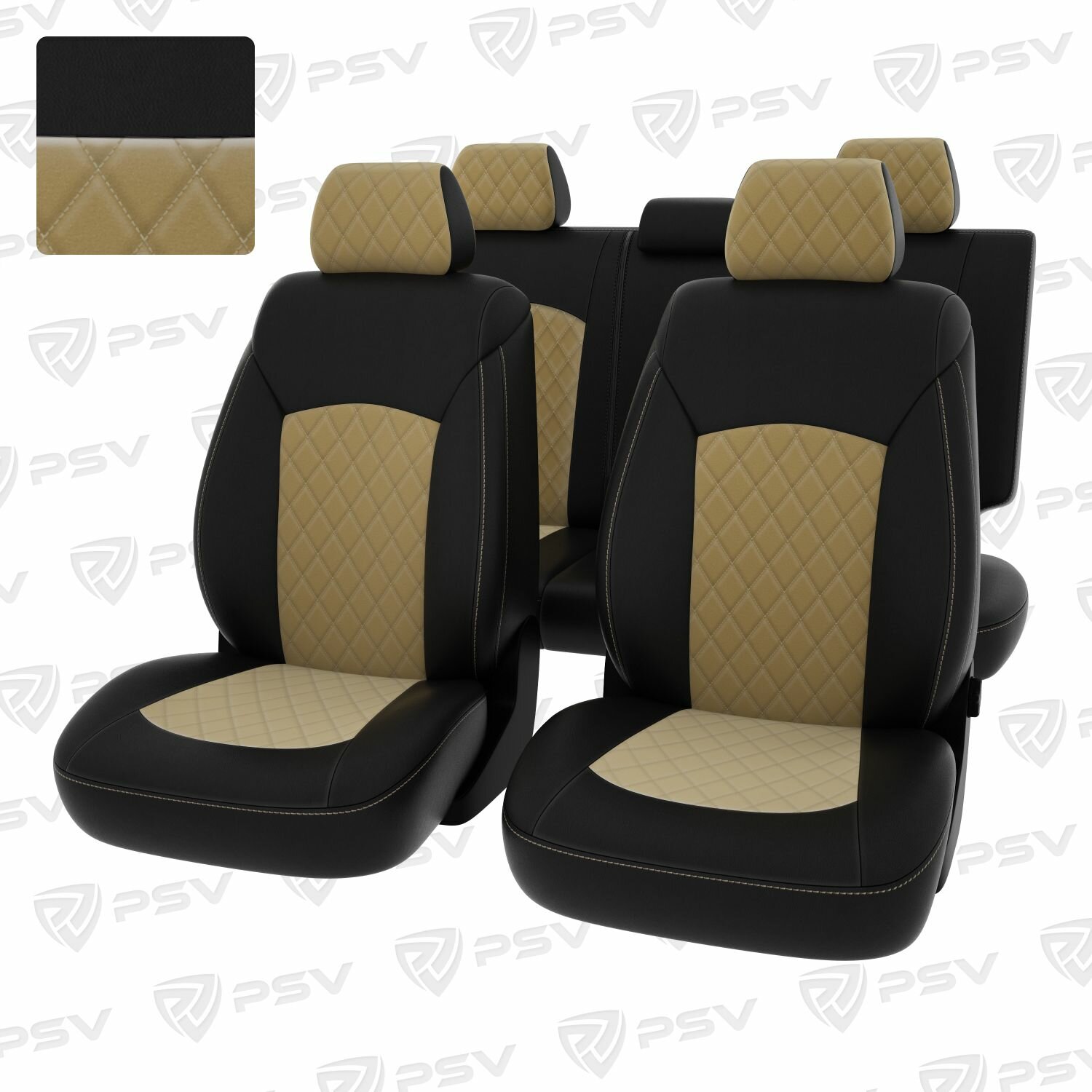 Купить Чехлы в машину PSV для Chevrolet Cruze/Шевроле Круз I 2009-2015 г. - 5 подголовников, ромб/отстрочка бежевая, черная экокожа + бежевый велюр "Оригинал"