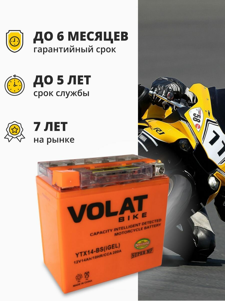 Аккумулятор для мотоцикла 12v Volat YTX14-BS(iGEL) прямая полярность 14 Ah 200 A гелевый, акб на скутер, мопед, квадроцикл 150x87x145 мм интересное: