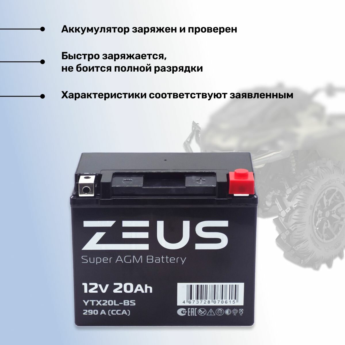 Аккумулятор для мотоцикла, квадроцикла, мопеда, гироскутера стартерный ZEUS SUPER AGM 20 А*ч Прямая полярность (YTX20-BS, CT 12201, UTX20-BS)