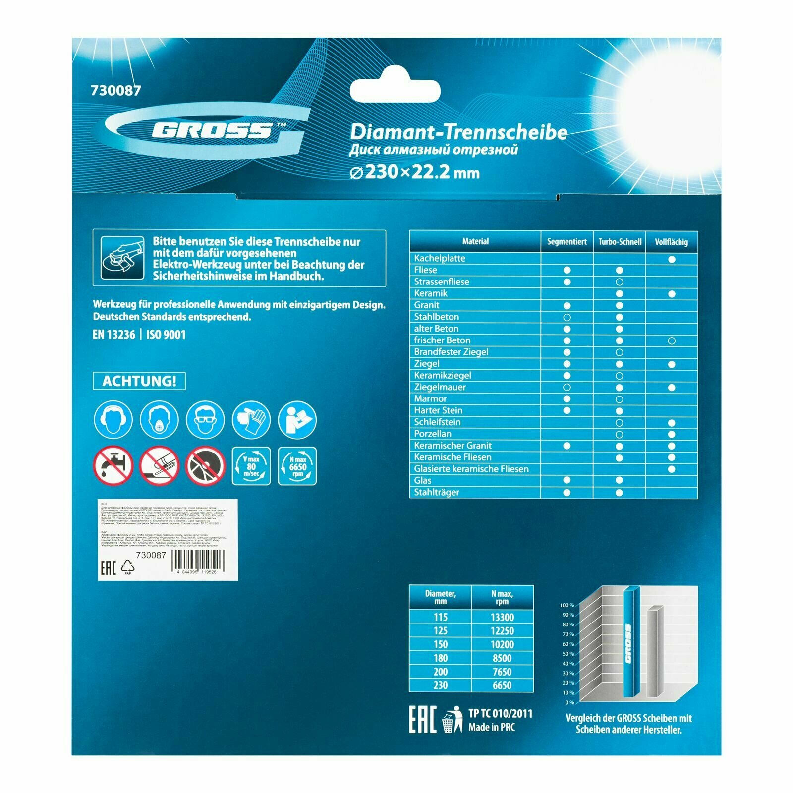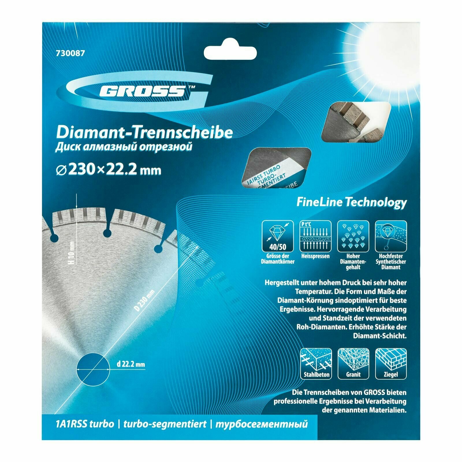 Диск алмазный Gross 730087, ф230х22,2мм, лазерная приварка турбо-сегментов, сухое резание Gross 3803 .