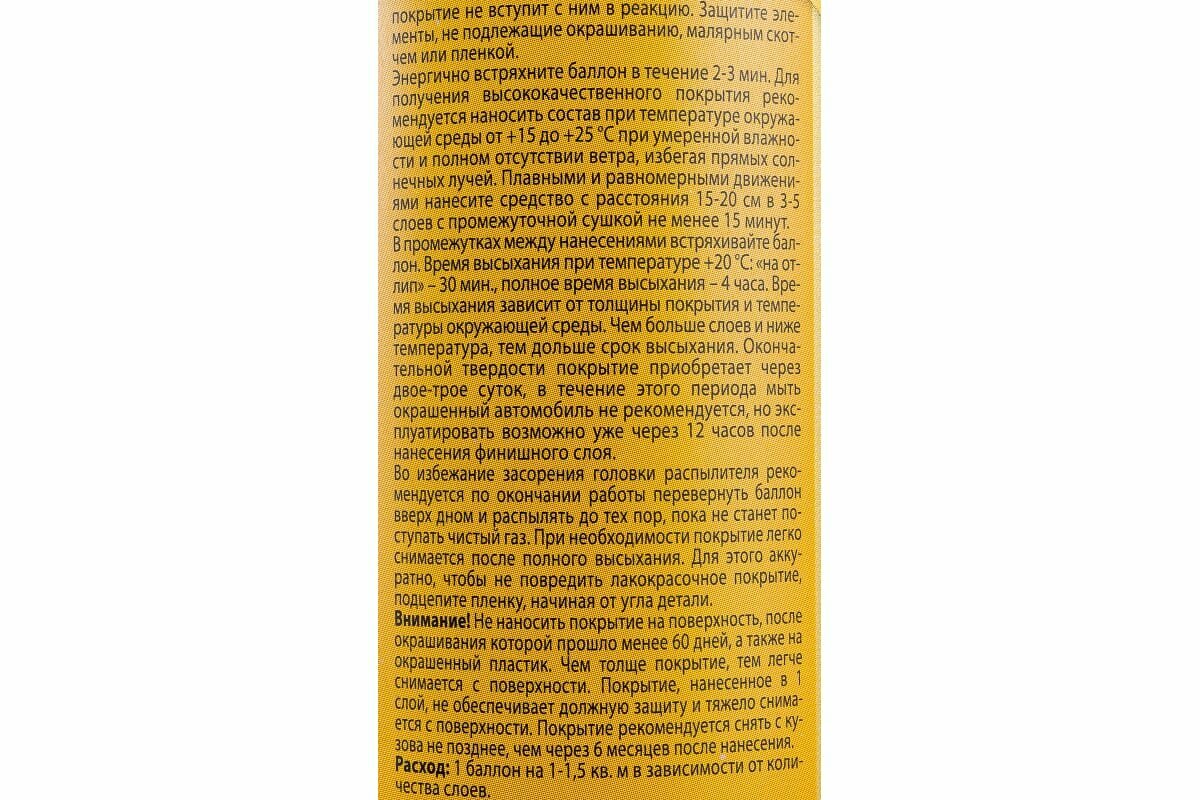 | Минусы: | меньше месяца и прозрачный цвет стал желтеть - у меня машина цвет серебристый металлик - видно стало издалека! Вид стал позорный! И самое главное - жидкая резина стала прочная как краска - попытался снять - невозможно!!! Хорошо в сети вычитал совет смыть уайт спиритом или бензином - это и спасло, а то думал машину перекрашивать придётся... |