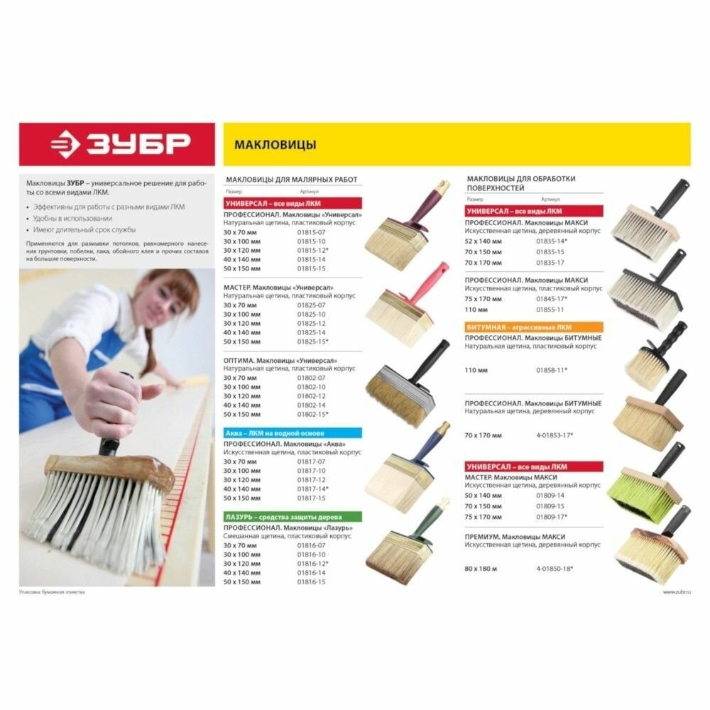 Ниже Вы можете прочитать отзывы на Кисть-макловица битумная, 110 мм Зубр 01858-11, ознакомится с подробными характеристиками, посмотреть интересные обзоры и фотографии на Кисть-макловица битумная, 110 мм Зубр 01858-11.