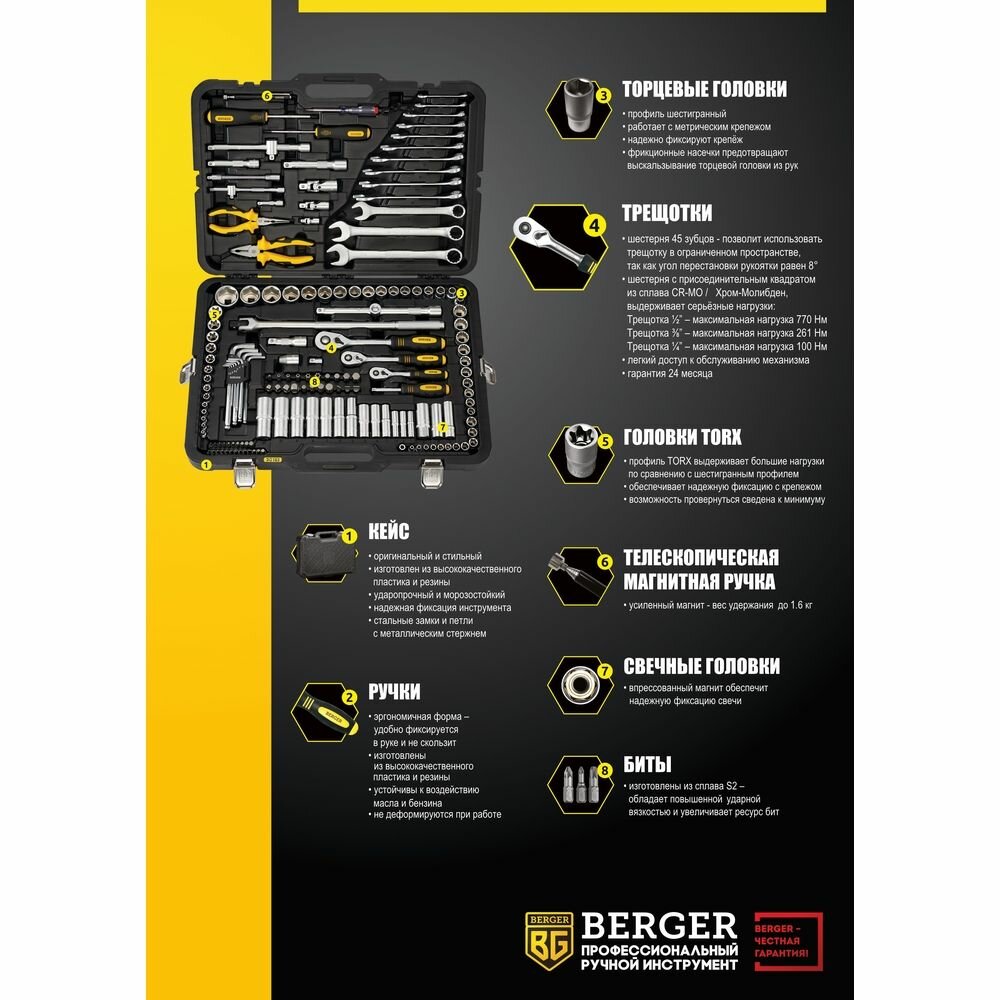 Профессиональный набор инструментов BERGER 163предмета 1/2 - 1/4 -3/8 «ганновер» BG163-121438