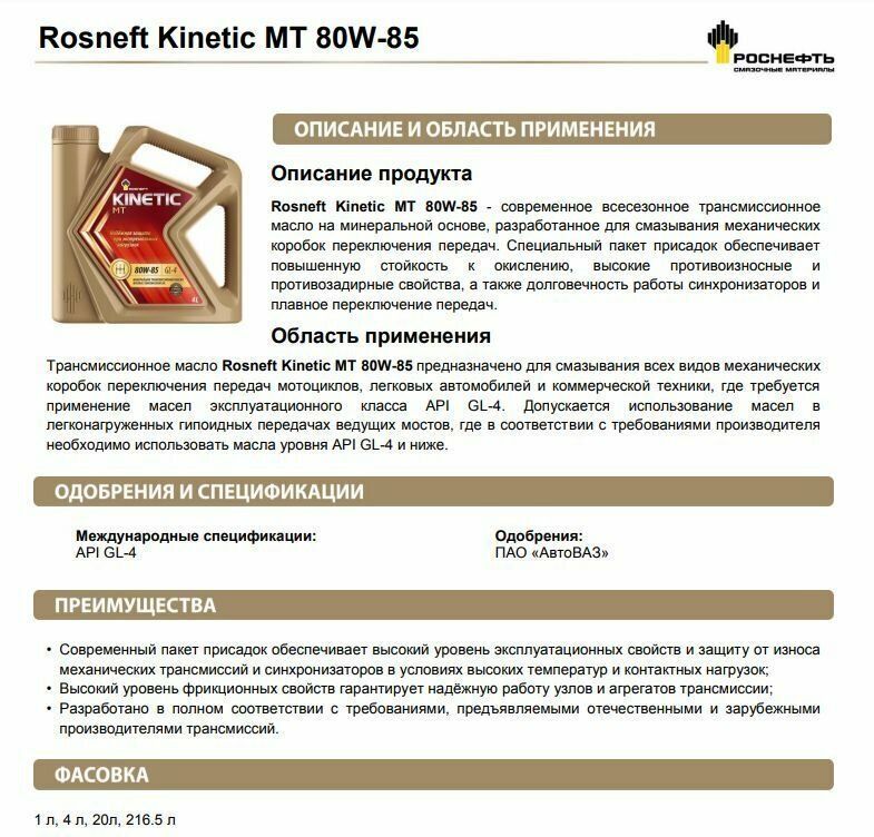 Масло Трансмиссионное Rosneft Kinetic Mt 80W85 Минеральное 4 Л 40817842 Rosneft арт. 40817842