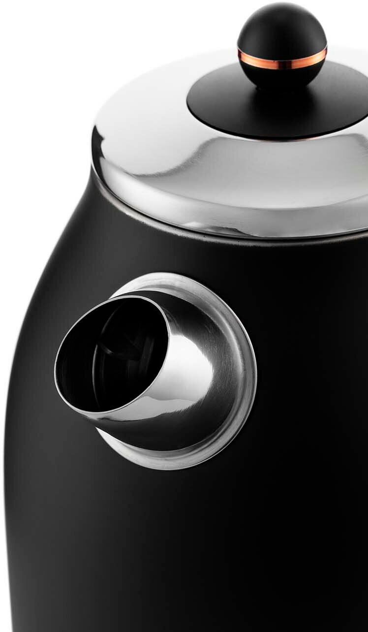 Очень стильный дизайн. Черный цвет отлично сочетается с металлическими деталями. Покрытие чайника очень приятное на ощупь, матовое. Корпус металлический, а не пластиковый (один из важнейших критериев выбора). Чайник довольно тихий, в сравнении с аналогичными по мощности электрическими чайниками. |
