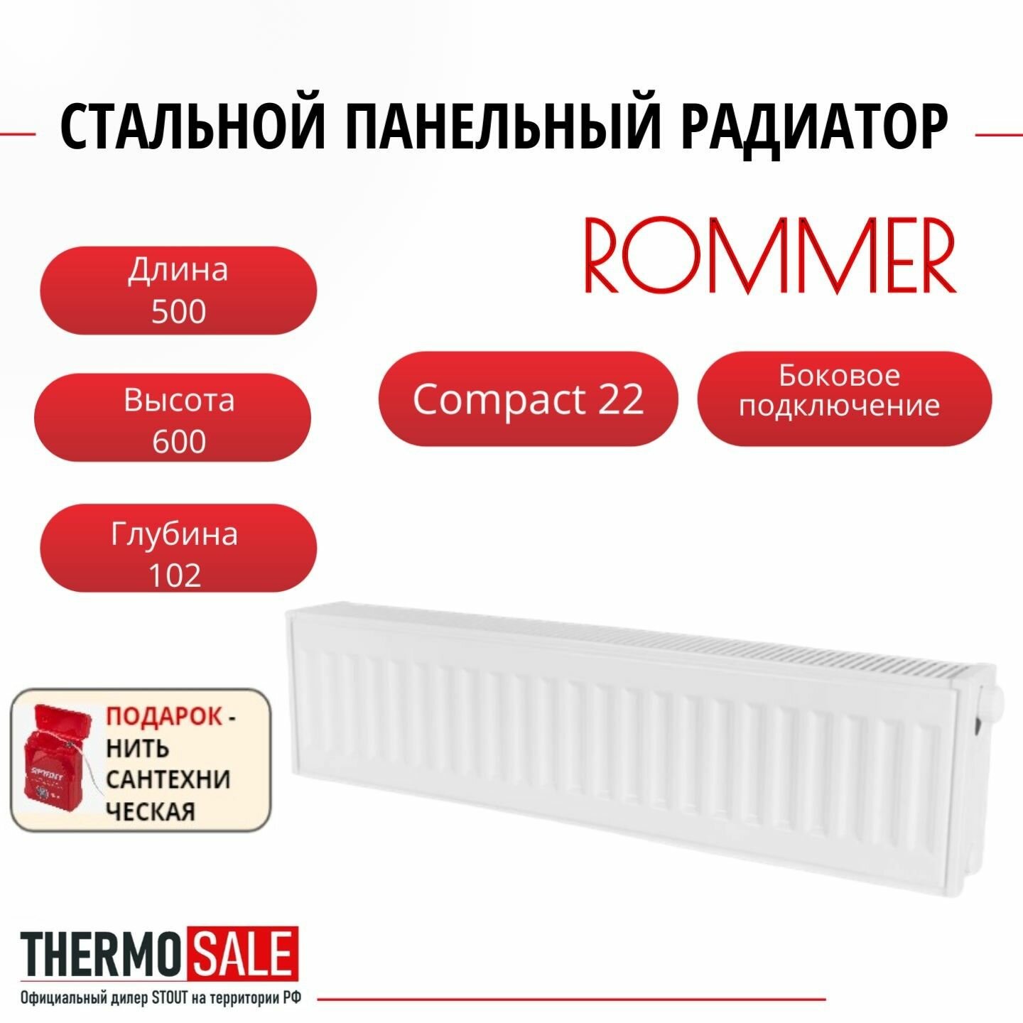 СохранитьРадиатор стальной панельный ROMMER 600х500 боковое подключение Compact 22/600/500 Нить сантехническая интересное: