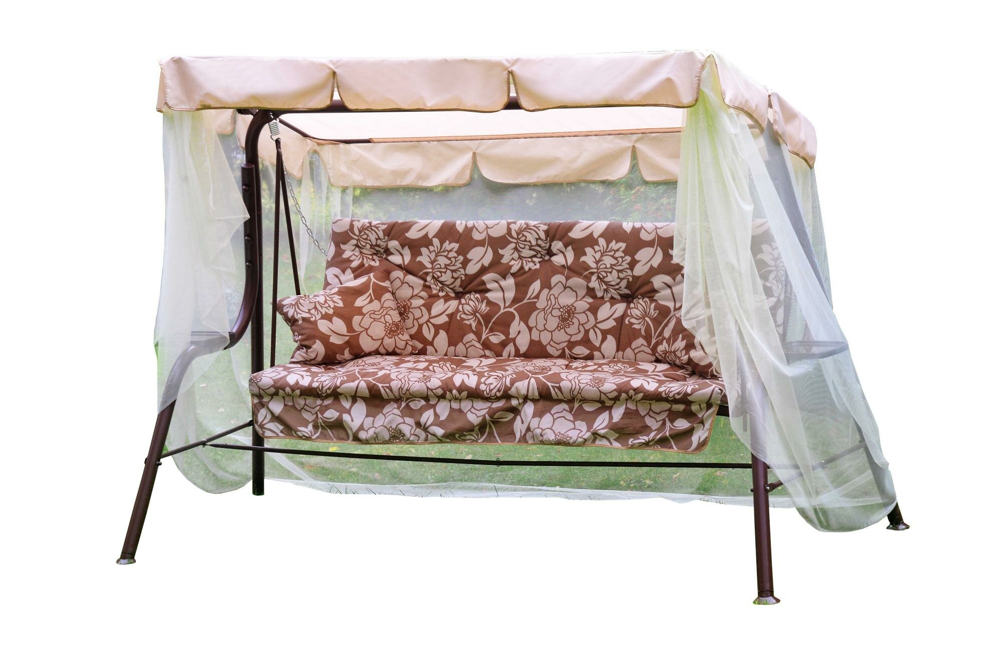 Качели садовые 3-х местные Ольса Варна каркас коричневый, ткань бежевая с узором с1103