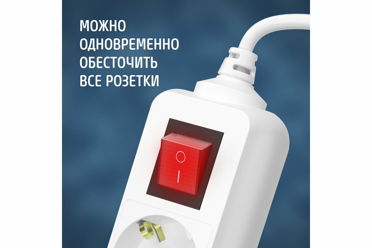 Сетевой фильтр удлинитель фотон 10А 3 метра 5 розеток с выключателем с заземлением белый, ГОСТ