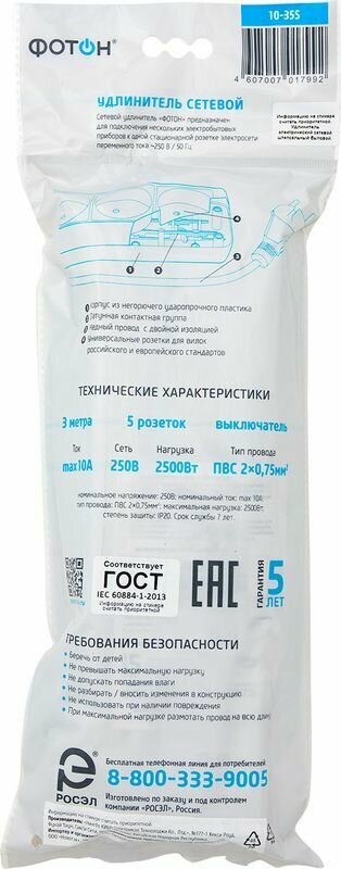 Сетевой фильтр удлинитель фотон 10А 3 метра 5 розеток с выключателем с заземлением черный, ГОСТ