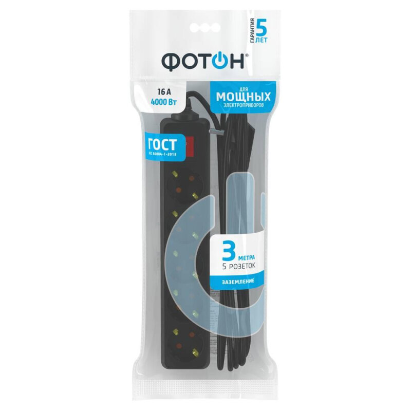 Сетевой фильтр удлинитель фотон 10А 3 метра 5 розеток с выключателем с заземлением черный, ГОСТ