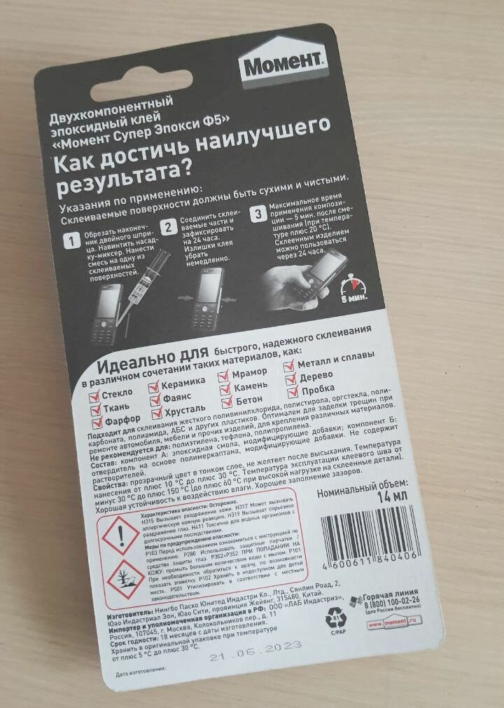 | Минусы: | Клей(тюбик) пришёл грязный и мятый, срок изготовления 08.2020, если судить по описанию на Яндексе то он уже просрочен, если по описанию на тюбике то через 2 месяца просрочится (получил 16.05.22), горе такому продавцу. |