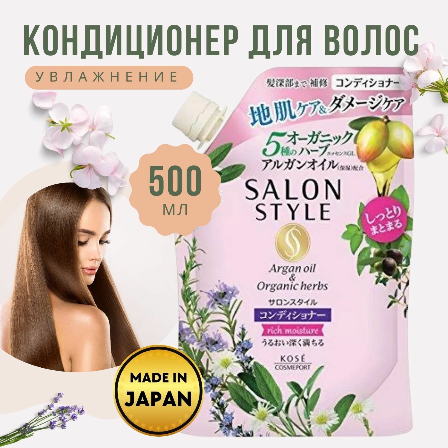 KOSE Кондиционер для волос увлажняющий Salon Style Rich Moisture, с органическими маслами, с ароматом цветов и трав, 500мл