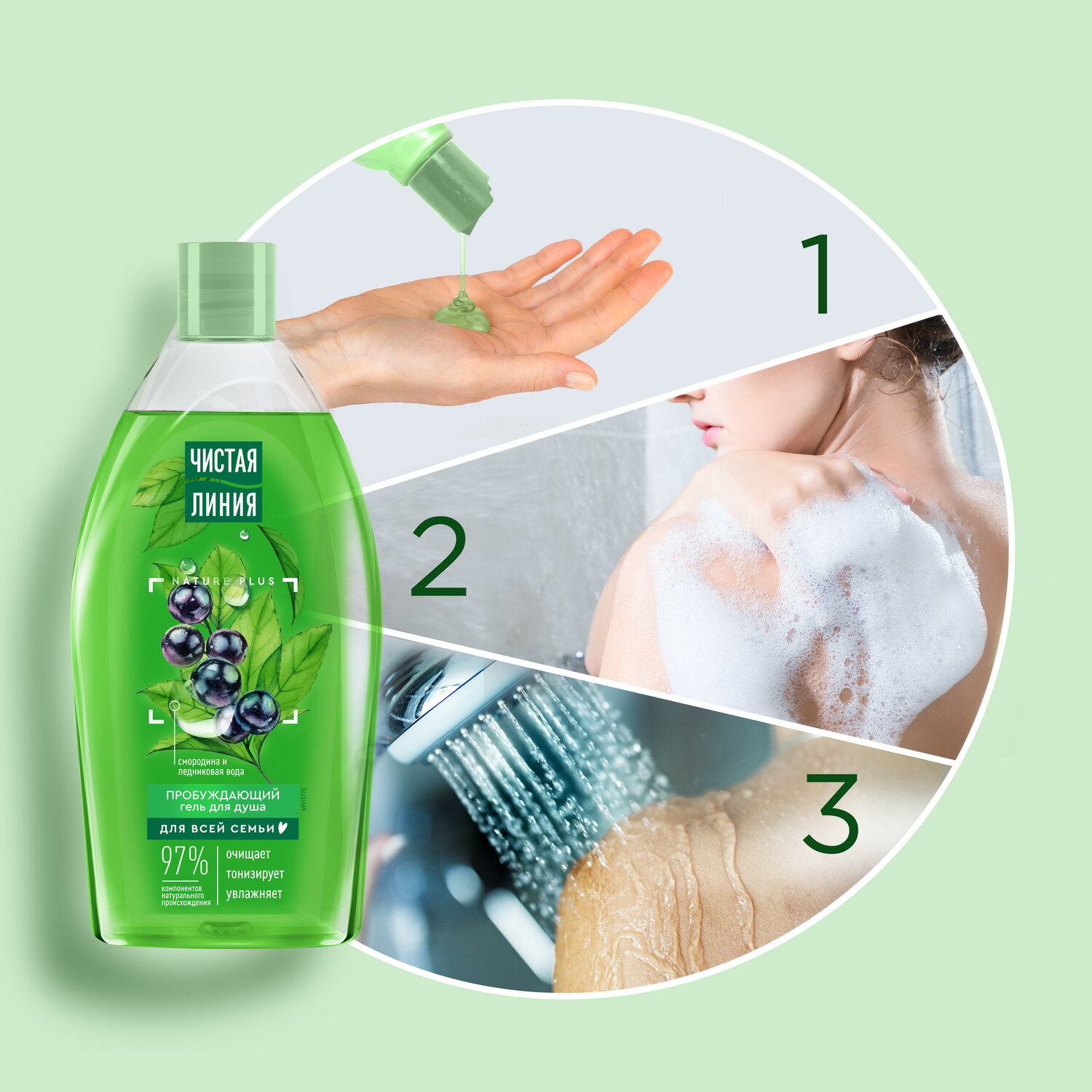 Гель для душа Чистая линия пробуждающий на 100% натуральной основе, смородина и ледниковая вода 250 мл ( 3 шт )